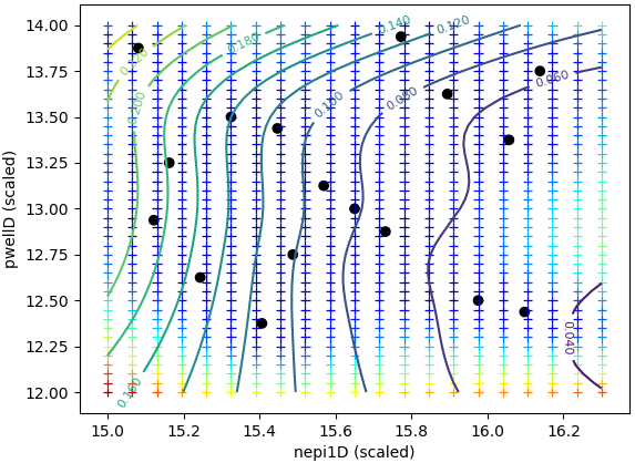 gp_.png 和 rsm_ 文件包含通过 optimizer.search 调用拟合总误差的响应面模型(RSM)一维切面线与二维切面图。图 12 展示了二维 RSM 等高线图,其中黑点表示模拟位置,背景十字标记代表 RSM 的不确定性------蓝色阴影表示较低不确定性,红色阴影表示较高不确定性。