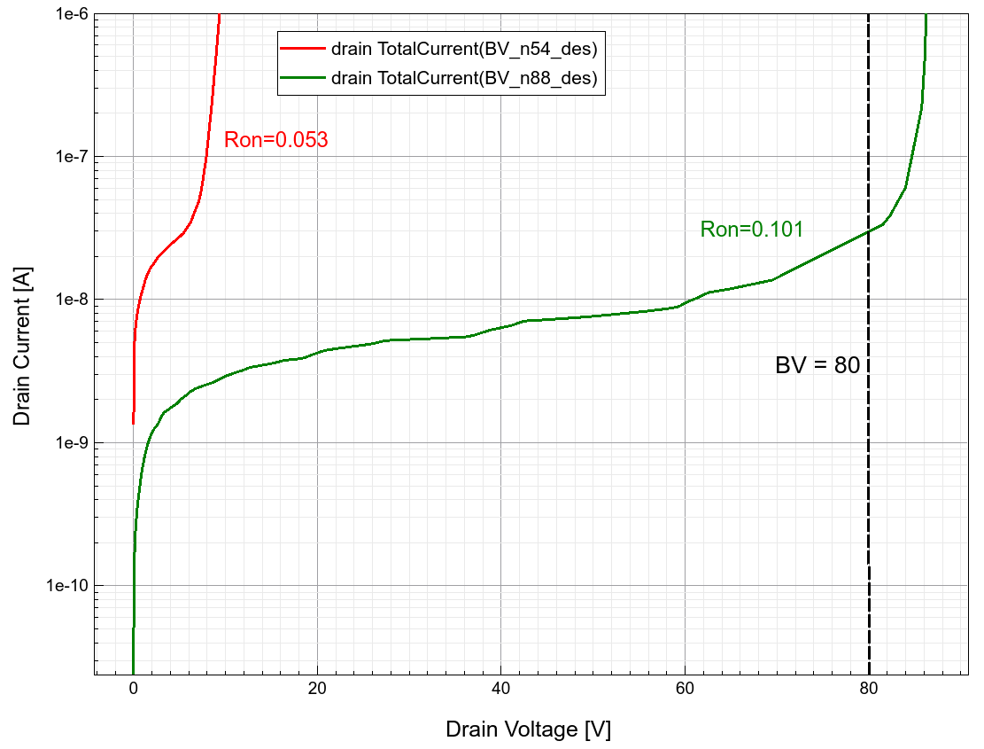 Ron 和 BV 会受到工艺参数的影响,例如 nepi1D 和 pwellD。本示例阐述了如何使用优化框架(Optimization Framework)来优化工艺参数,从而在击穿电压大于 80 V 的条件下,输出具有最小导通电阻的器件。