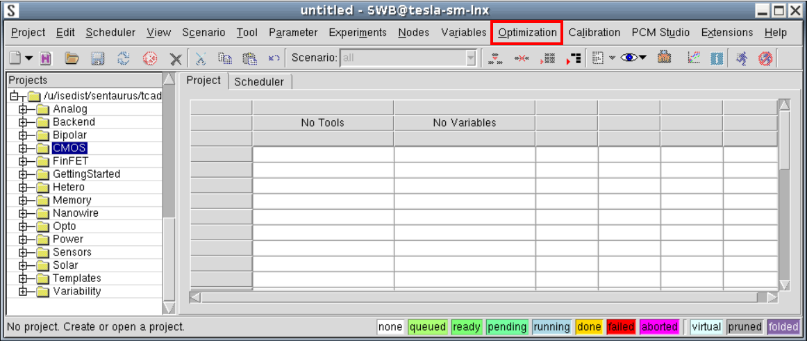 图1. 高级模式下 Sentaurus Workbench 主窗口(优化菜单已高亮显示)。(单击图像查看完整视图。)