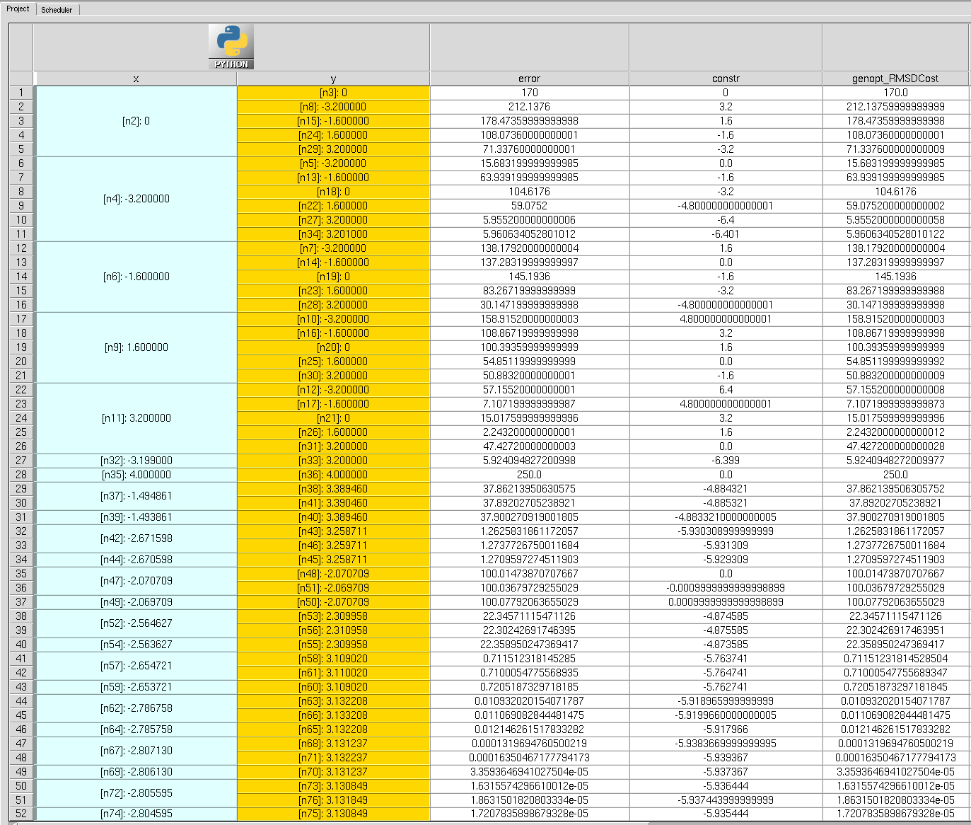 genopt_data 文件夹包含优化各阶段的 CSV 文件,其中记录了输出值、输出误差(与目标值的距离)及总误差,如图 10 所示。注意输出列数据包含在方括号内,若需在绘图应用程序中直接使用该文件,可能需要先移除这些括号。