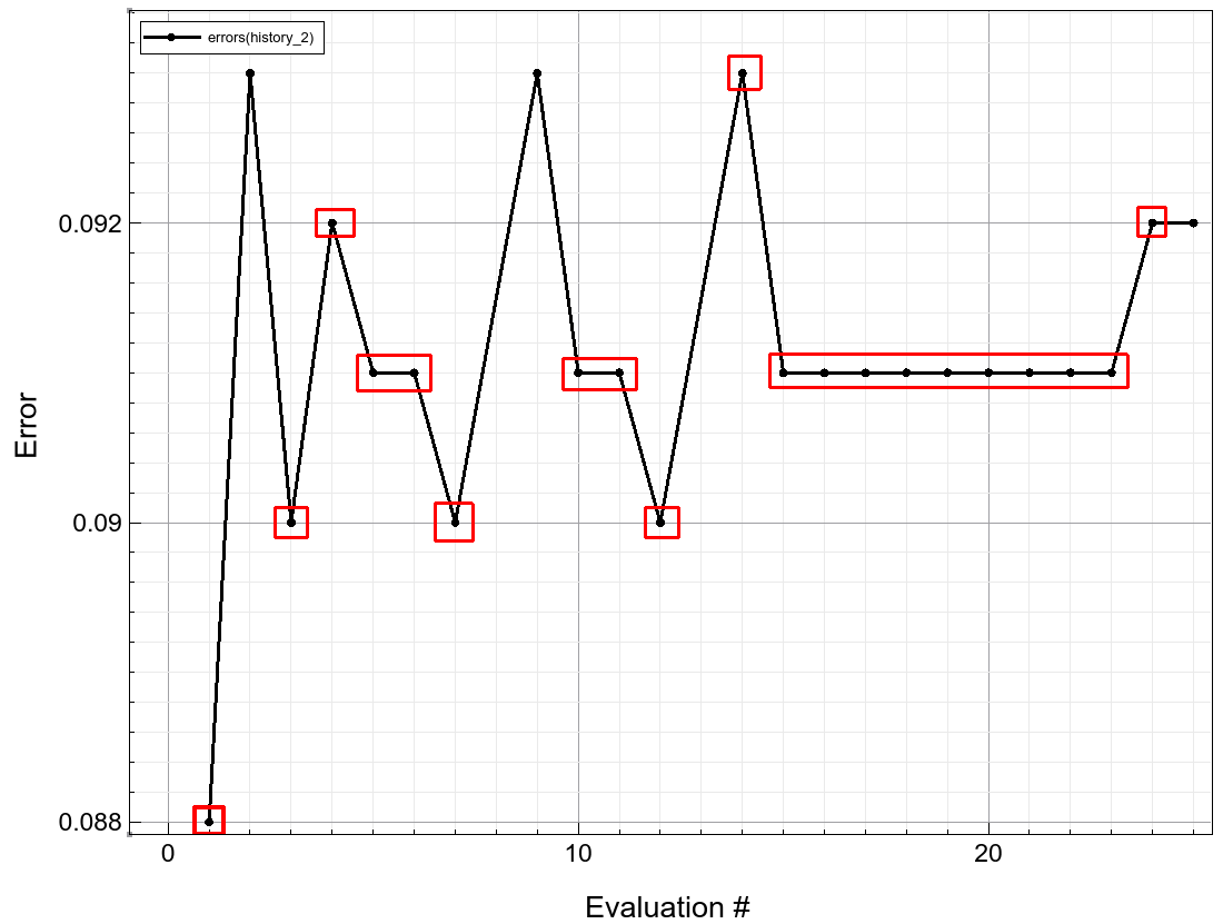 当一个实验完成后,会打印评估编号(该编号在每个阶段开始时重置为 1;参见图 4 中的蓝色框),后跟参数值、输出值和总误差(参见图 4 中的红色框)。