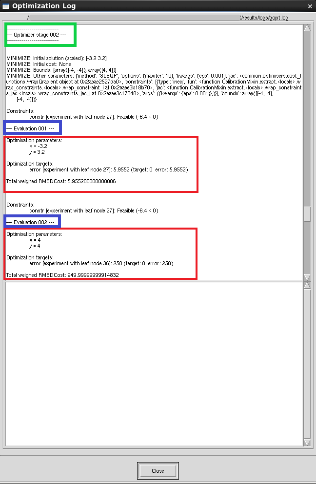 图 4 显示了输出日志的一个典型部分。每次调用优化器方法(如 optimize()、search() 和 sensitivity_analysis())被称为一个阶段 (stage),在其执行开始时会打印一个标题(参见图 4 中的绿色框)。