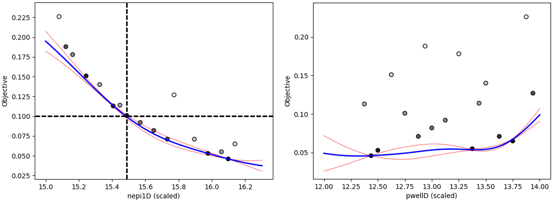 图 13 展示了一条在找到的最佳点处截取的一维切割线。在此图中,圆圈再次代表仿真数据。由于数据是二维的,并非所有点都距离切割线相同。该距离通过圆圈的背景颜色表示:颜色越深,表示距离切割线越近。此图展示了之前在函数图(图 6)中见过的特征性双势阱。蓝线对应于 RSM 的平均预测值,细红线则显示了预测均值周围的 ± 一个标准差范围。