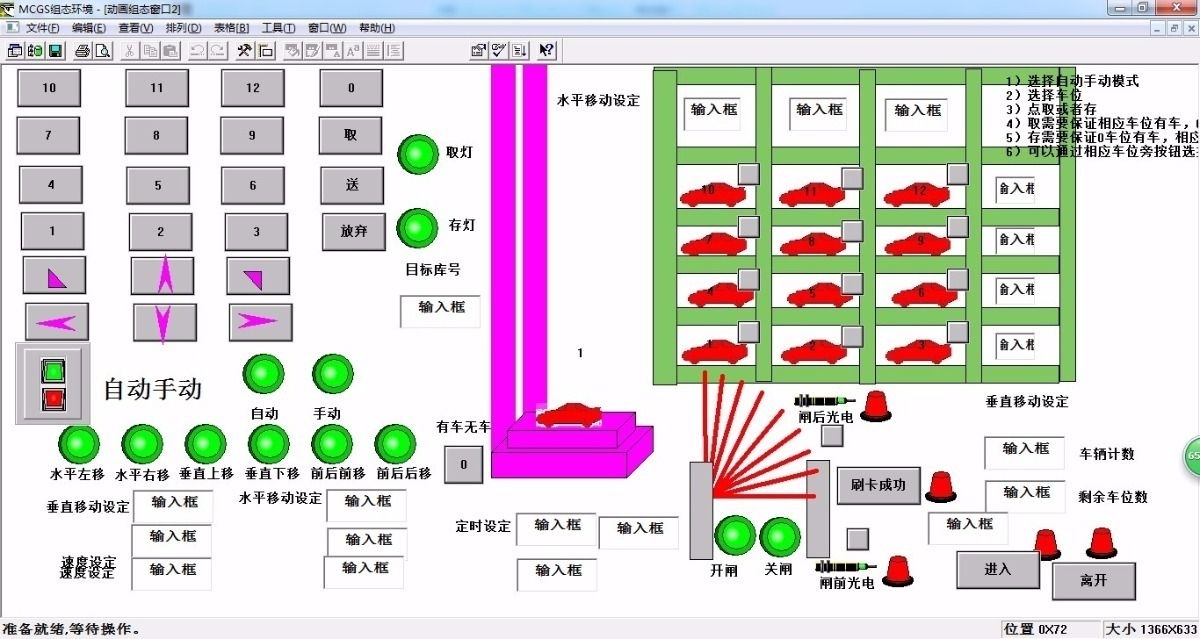 最近在搞一个3x4的书架式立体库项目,用的是三菱FX3U系列PLC配MCGS触摸屏。这玩意儿看着像大号快递柜,实际藏着不少工业自动化的门道。先带大伙儿看看硬件布局:三列四层的钢结构架,每格都装着光电开关做占位检测,升降电机用的三菱MR-JE伺服,货叉伸缩是气缸带磁耦传感器定位。