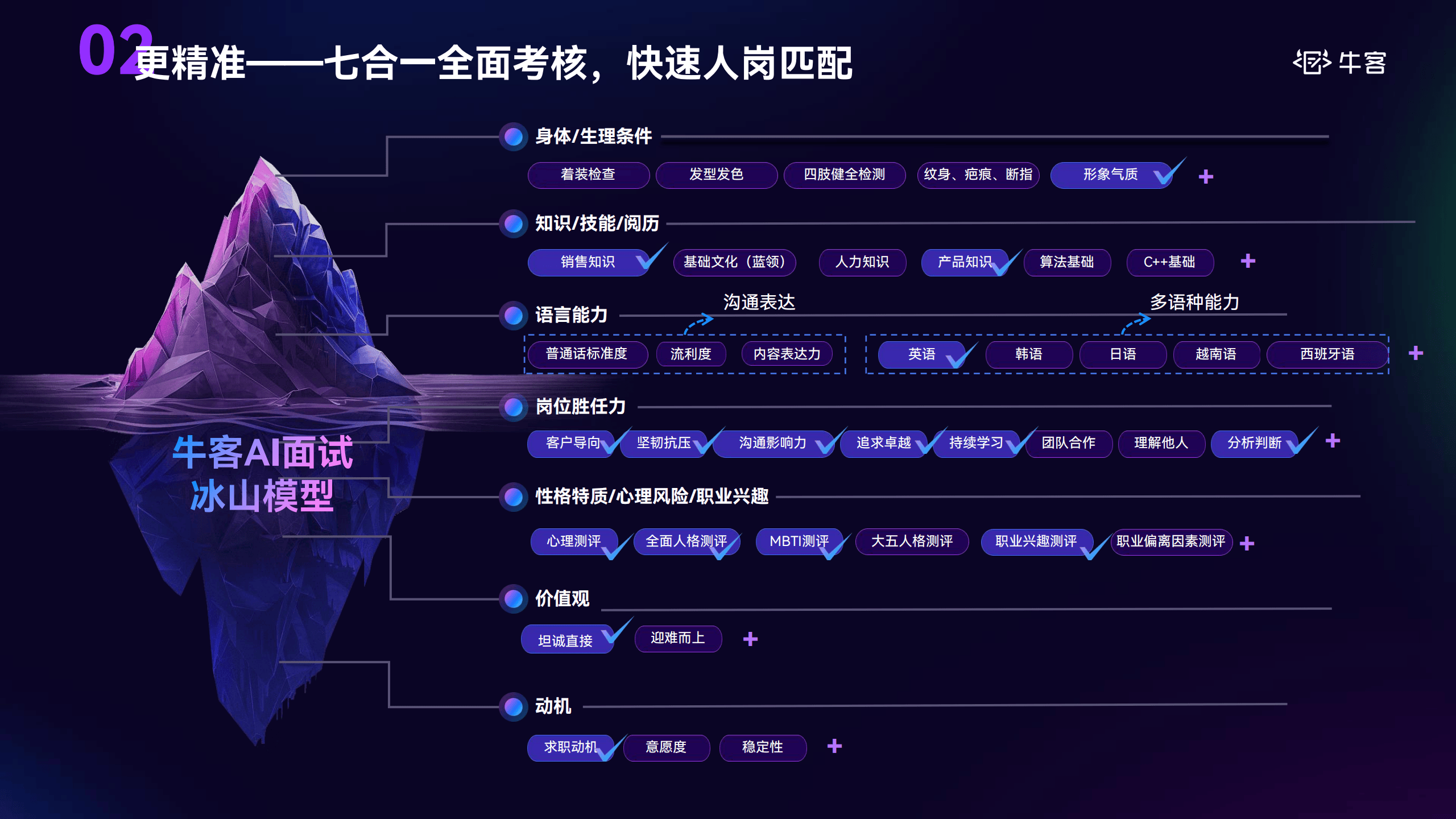 评估不应仅限"冰山之上"的知识技能。牛客AI面试覆盖专业能力、通用能力、语言表达、心理素质、工作偏好等维度,并支持蓝领岗位的形体检测(如纹身、肢体健全性)。