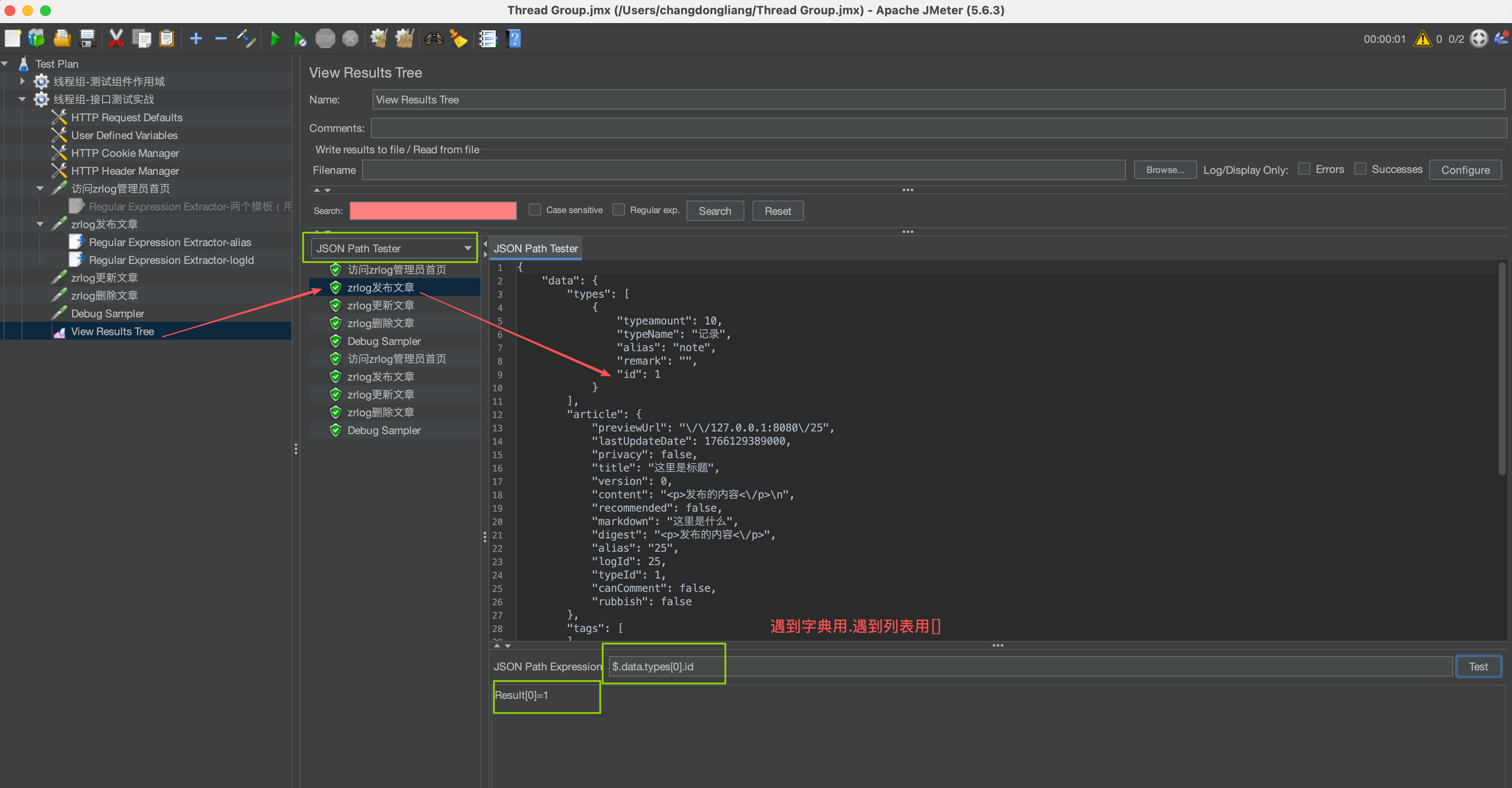 - 先做简单的发布文章请求,查看响应结果,比如要从结果中取出id,$代表根节点,.代表子节点,遇到字典用.,遇到列表用[],方括号里面写要取的值的下标值,列表下标值从0开始。