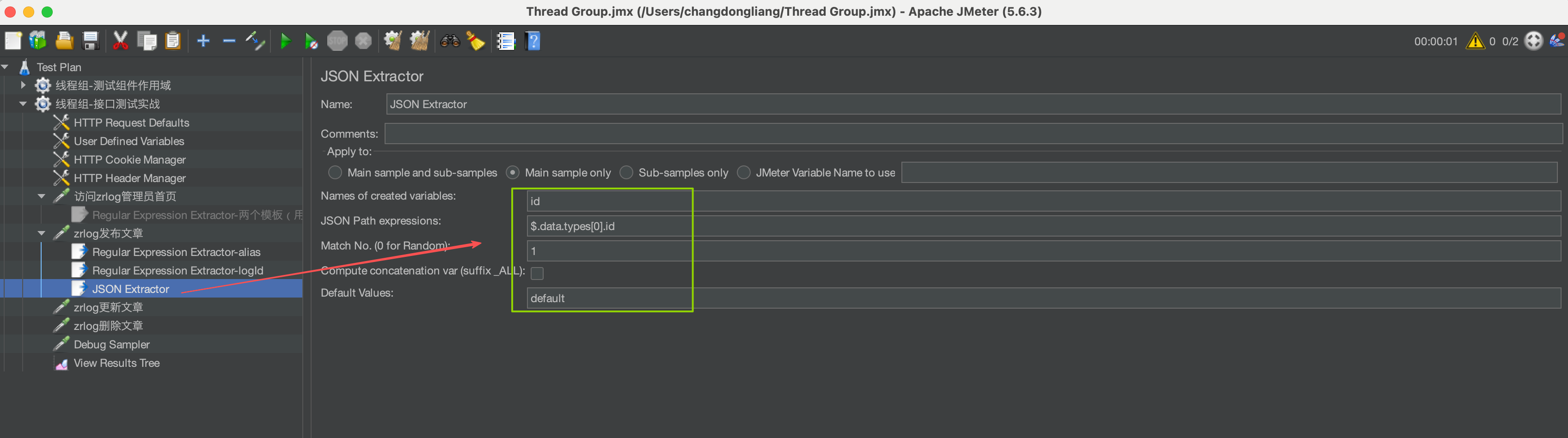 - 在线程中加入JSON提取器,提取后就可以在后面的接口调用中引用id。