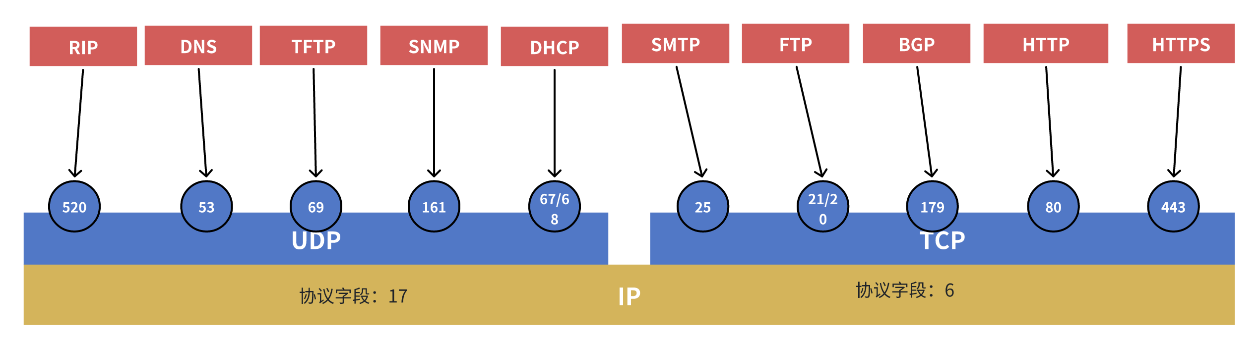 熟知端口号:0~1023,IANA把这些端口号指派给了TCP/IP体系中最重要的一些应用协议,例如:FTP使用21/20,HTTP使用80,DNS使用53.