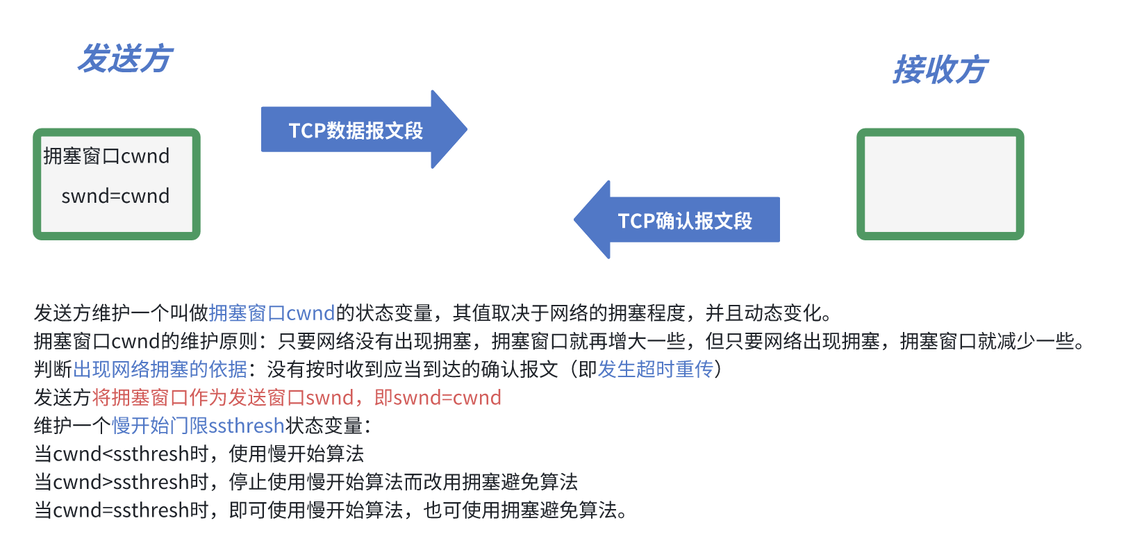 重传计时器超时 ------>判断网络可能出现了拥塞,进行以下工作:将ssthresh值更新为发生拥塞时cwnd值的一半