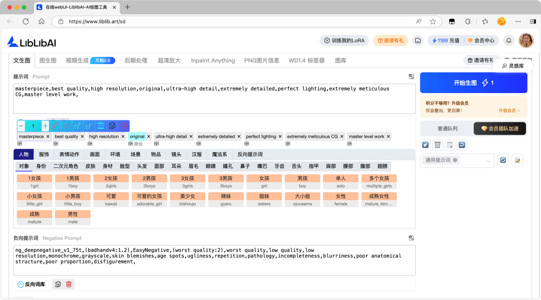 先在提示词输入框中,编写正向提示词和负向提示词。