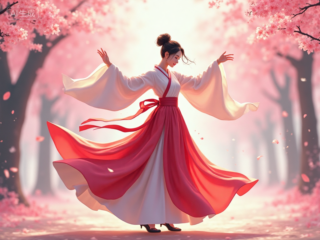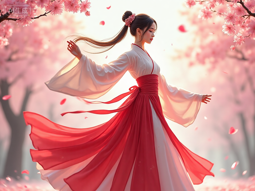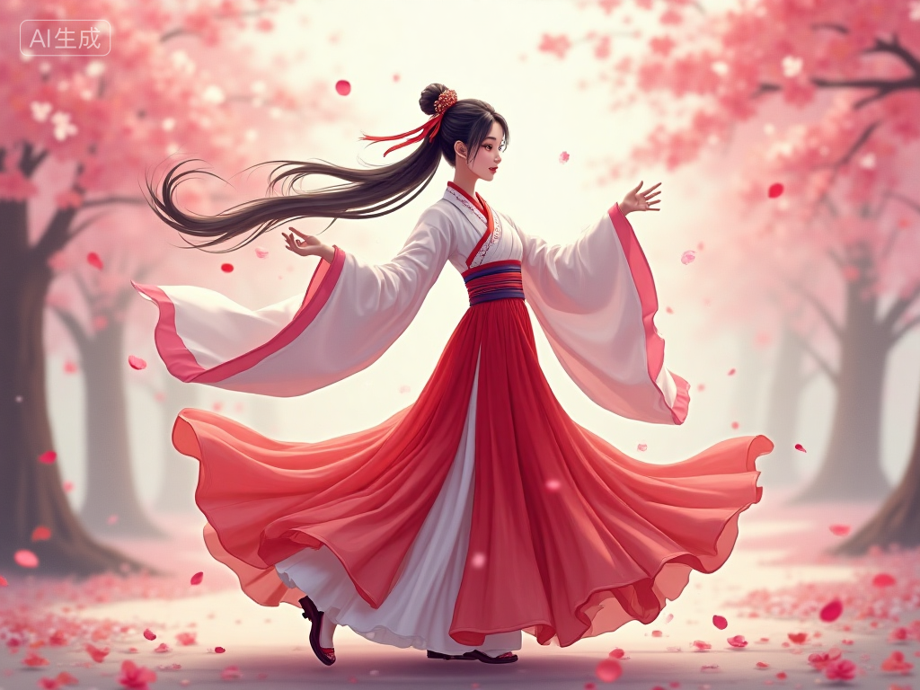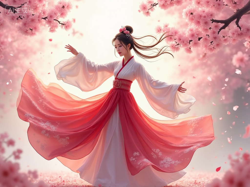 - 正向提示词(英文):A girl,dressed in traditional costume,a magnificent Hanfu,flowing skirt,dancing,light and graceful dance,elegant movements,blooming cherry blossoms,falling petals,illustration style,fresh,beautiful,full shot,depth of field lens,vivid colors,perfect lighting,soft,warm,high definition quality,absurdres