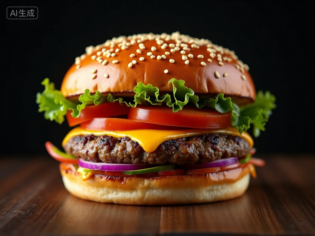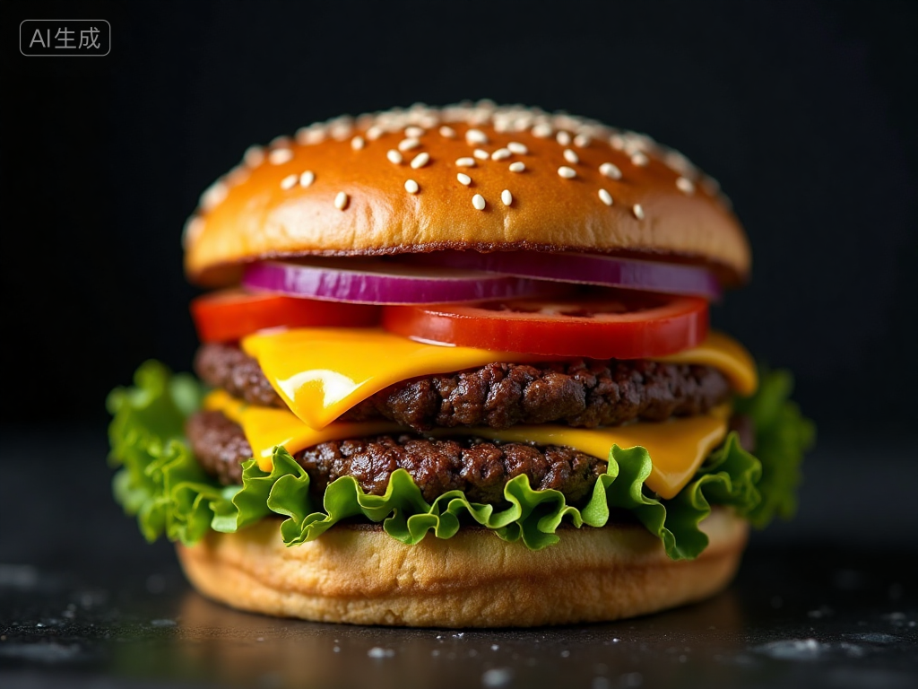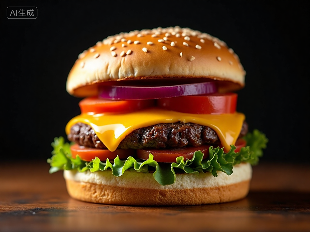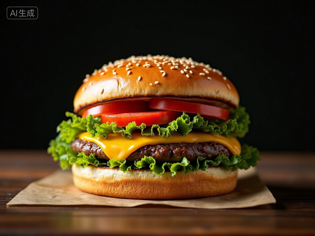 - 正向提示词(英文):a hamburger, product shot, dark background, vibrant colors, rich layers, high saturation, perfect lighting, natural transitions, realism, depth of field, perfect photography, master level photography, ultra-high definition, ultra-high details
