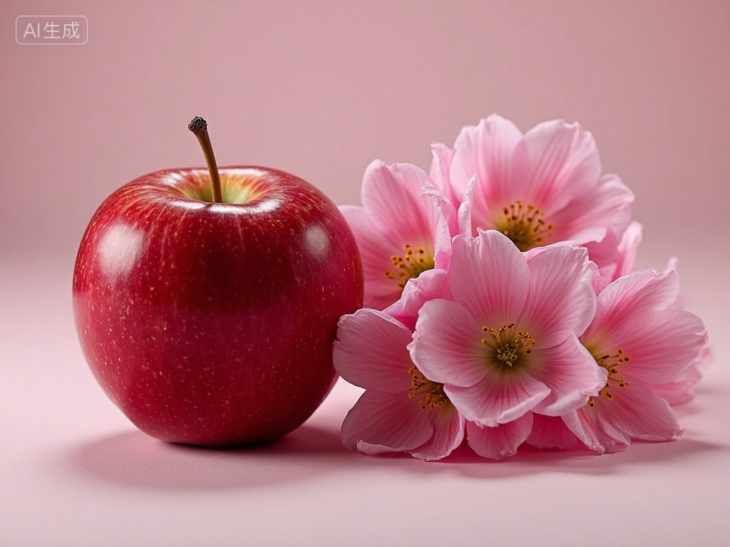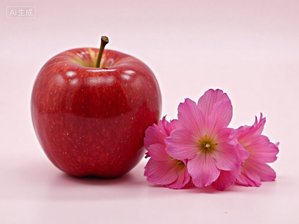 - 正向提示词(英文):A red apple,a bunch of pink flowers,the apple on the left,the flowers on the right