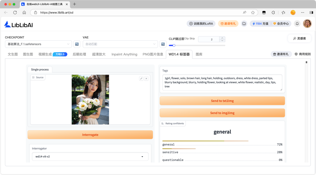 在菜单栏中,可以选择 Tag 反推(Tagger)/ WD 1.4 标签器,上传图像后开始反推。