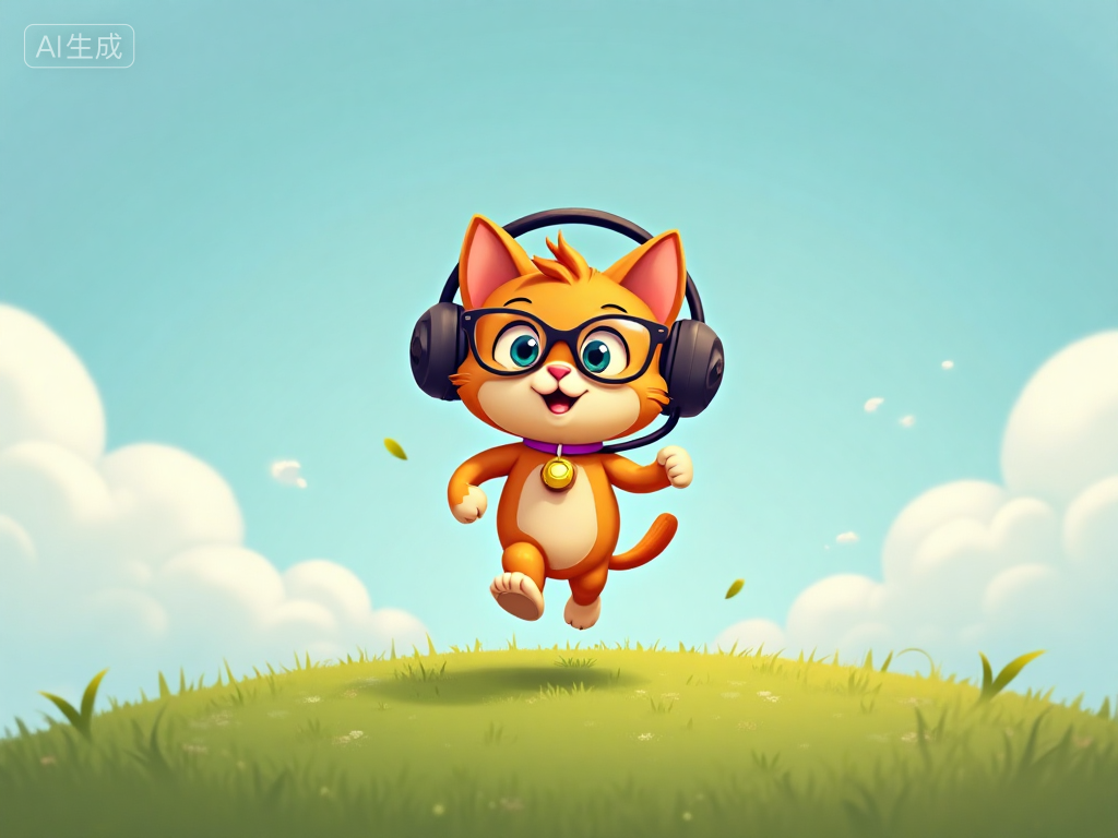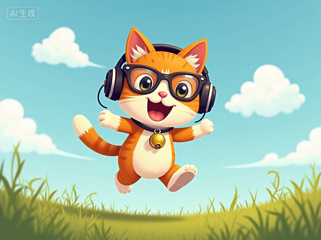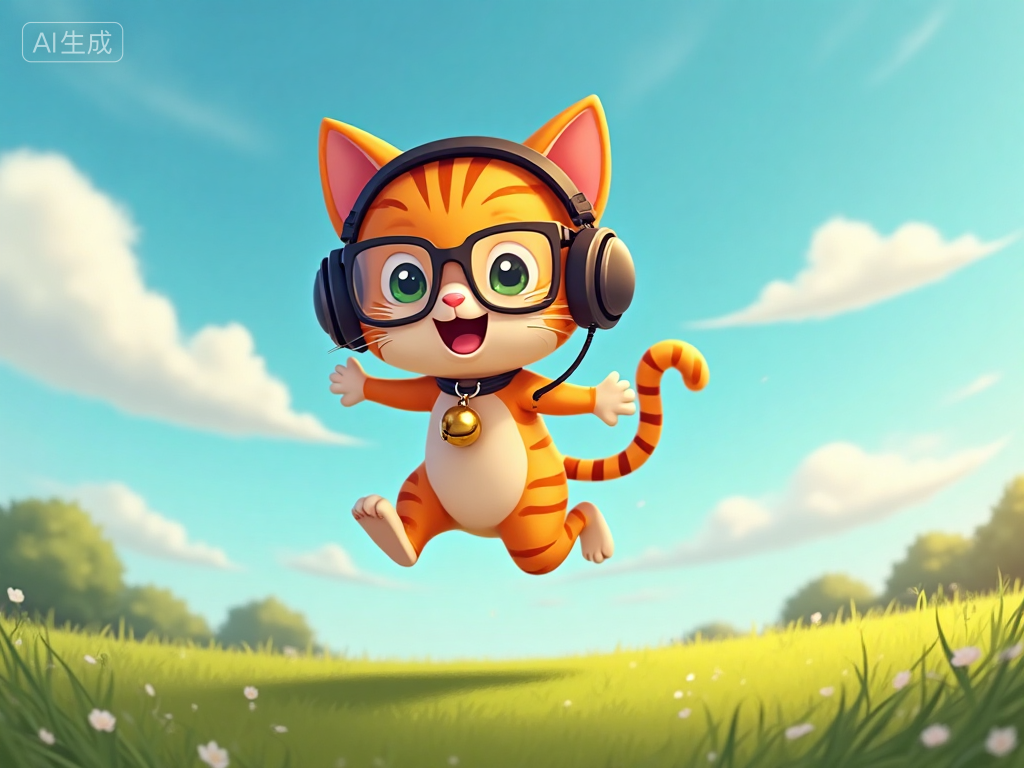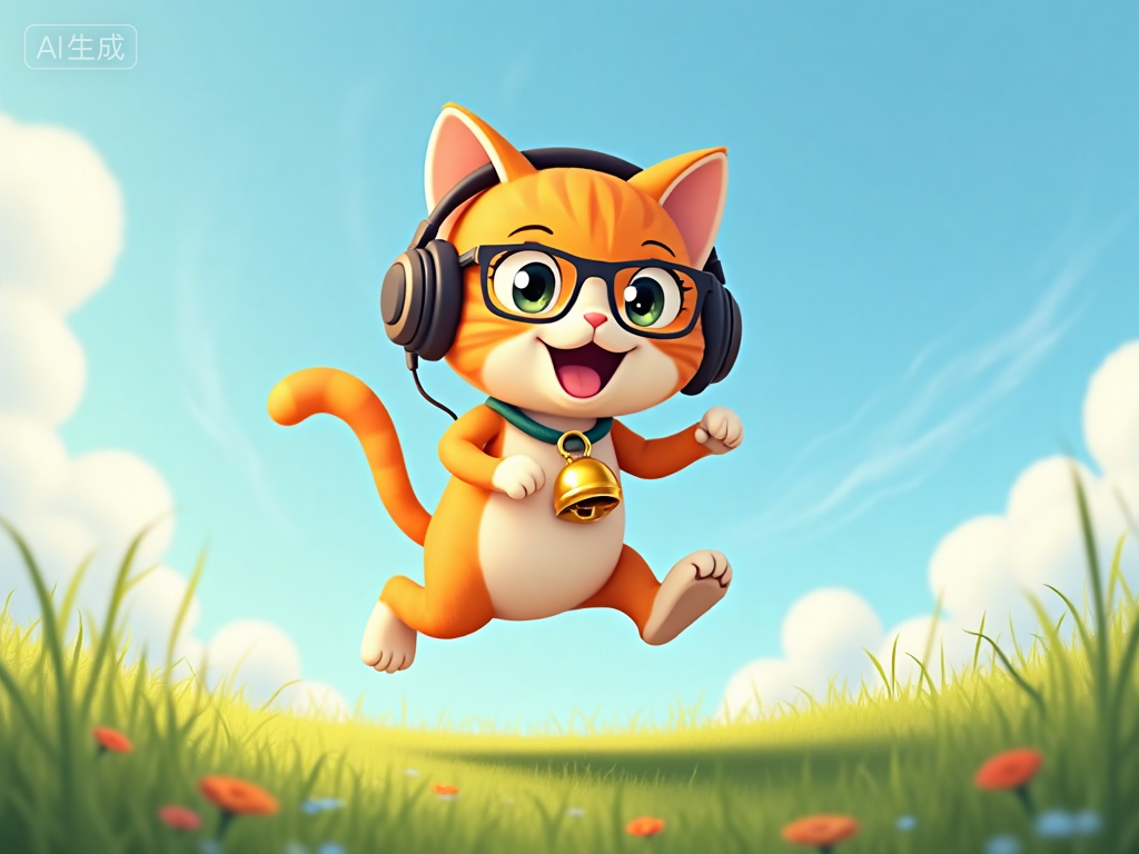 - 正向提示词(英文):Cat,running,jumping,with a bell hanging on the chest,wearing headphones,wearing glasses,on the grassland,blue sky with white clouds
