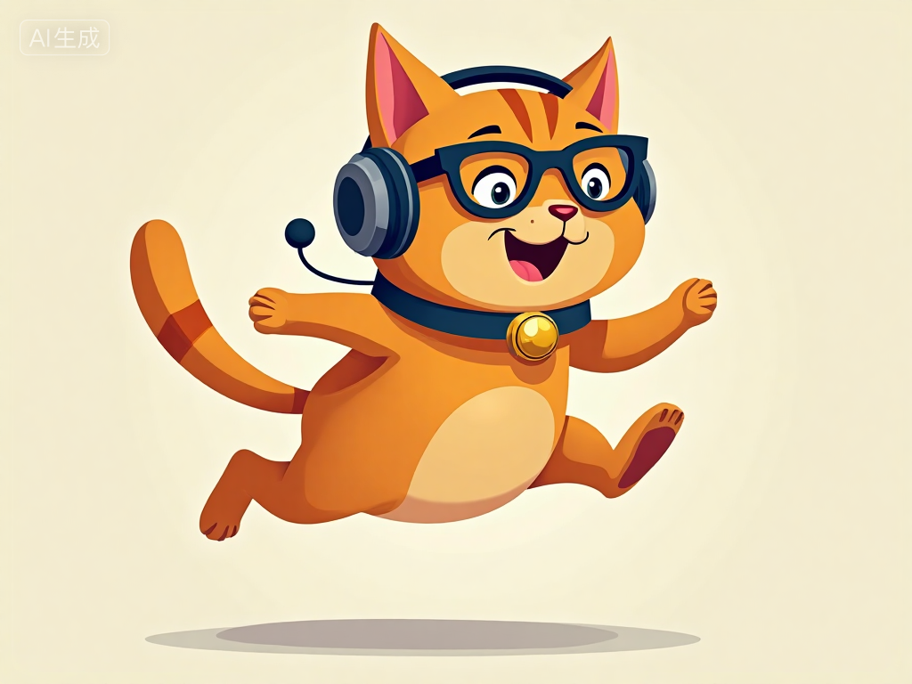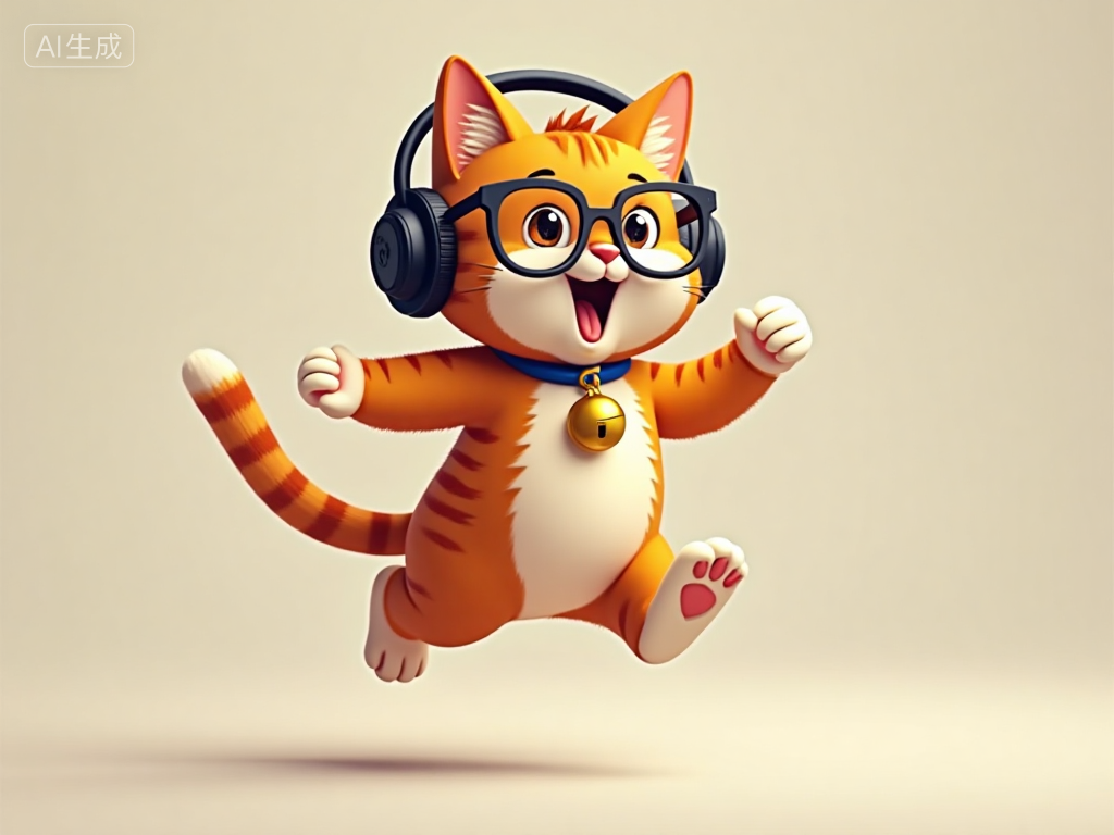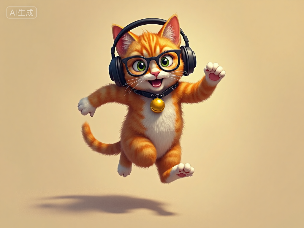 - 正向提示词(英文):Cat,running,jumping,wearing a bell on the chest,wearing headphones,wearing glasses