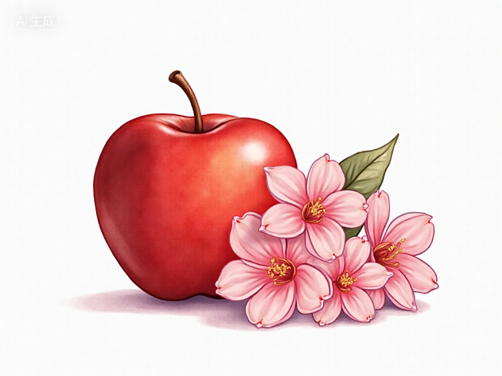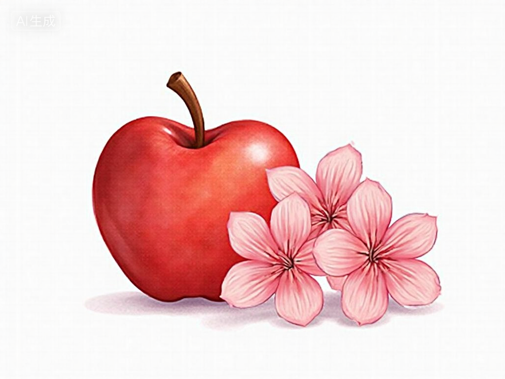 - 正向提示词(中文):一个红色的苹果,一束粉色的花,苹果在左边,花在右边,水彩风格