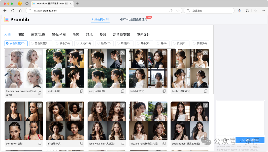 Promlib 提示词画廊是一个 AI 绘画提示词分享平台,提供用于 AI 绘画(Stable Diffusion 和 Midjourney)的提示词,并且提供该提示词在 AI 绘画中的呈现样式,做为给 AI 绘画爱好者的参考,目前该平台由个人开发者进行开发与维护,致力于把 Promlib 提示词画廊打造最大的 AI 绘画提示词分享平台。