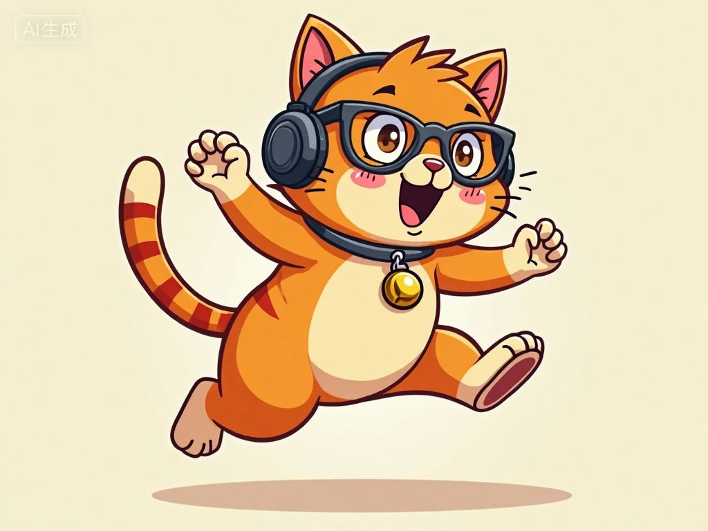 - 正向提示词(中文):猫,奔跑,跳跃,胸前挂着铃铛,戴着耳机,戴着眼镜