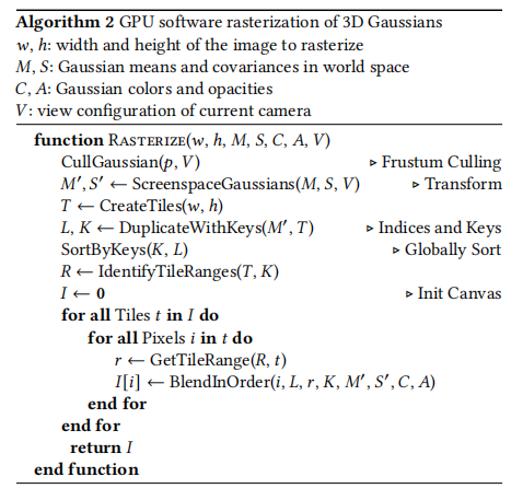 - 实时渲染:将 3D 高斯投影为 2D 椭圆,通过瓦片排序、可见性感知混合,实现高效光栅化与新视角合成。