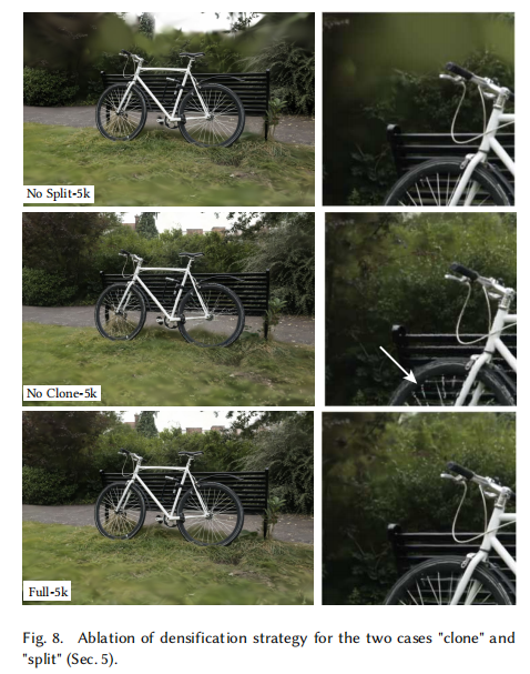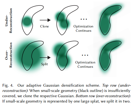 自适应密度控制:分裂(Split)和克隆(Clone)分别提升 2.4dB 和 0.14dB,共同确保场景覆盖,可视化如图;