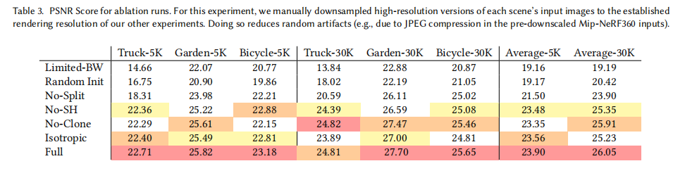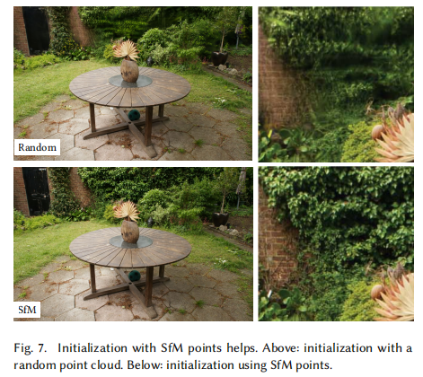 SfM 初始化:Random Init 比 Full 低 3.73dB,说明 SfM 点云能提供有效先验,加速收敛,可视化如下图。