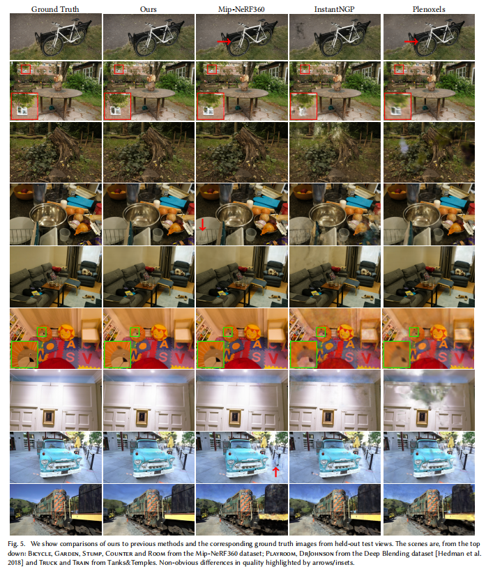 - 真实场景:Mip-NeRF360(10 个场景)、Tanks&Temples(2 个场景)、Deep Blending(2 个场景);