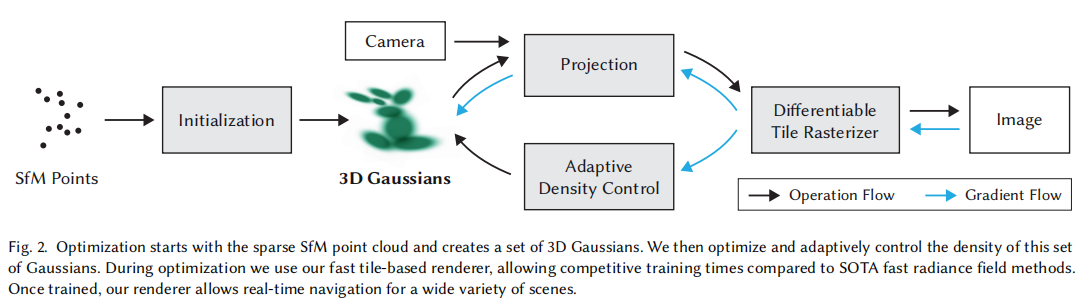 本文方法的核心思路是:用无结构的 3D 高斯集合建模辐射场,通过自适应优化调整高斯分布,再利用 GPU 加速的瓦片化光栅化实现实时渲染。整体流程如图 2 所示,分为三个关键阶段:
