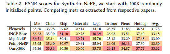 即使在随机初始化(无 SfM 点云)的合成场景中,本文方法仍达到 SOTA 水平,验证了表示的灵活性。