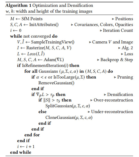 - 初始化:SfM 稀疏点云初始化,协方差矩阵初始化为各向同性(轴长为最近三个点的平均距离);