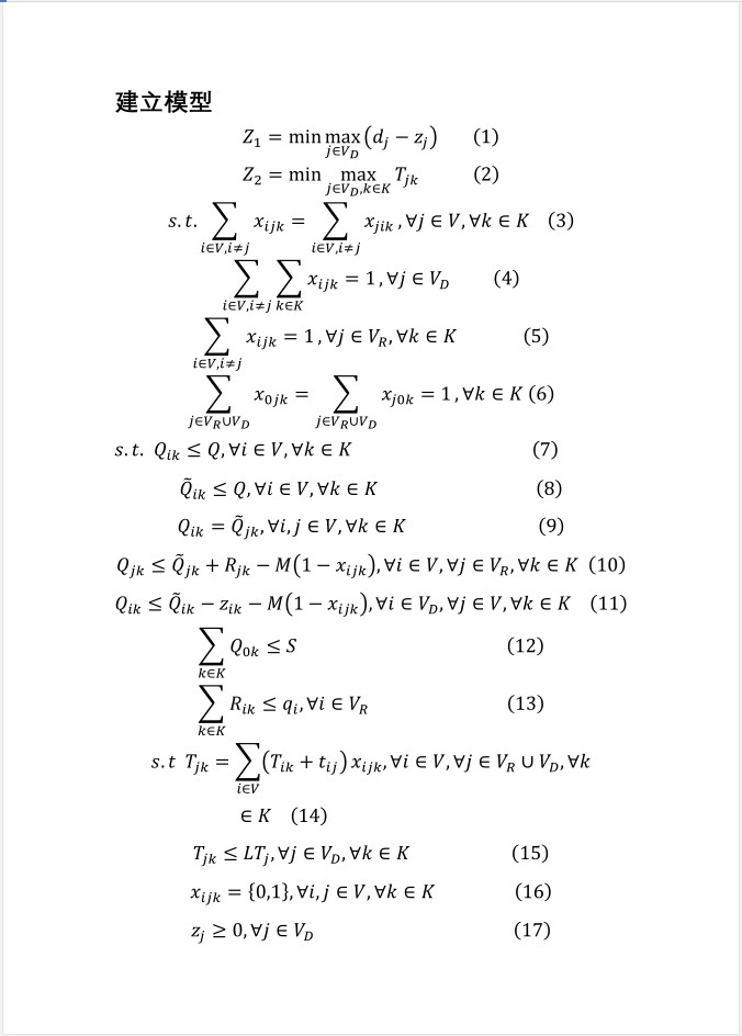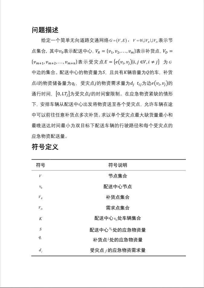 基于NSGA2的多目标车辆路径规划 目标1为受灾点缺货量最大值最小,目标2为需求点最晚送达时间最小 ,问题描述和具体模型如图所示 首先染色体编码的话,采用整数编码方式,总共30996个变量,前30000个变量是三辆车的100*100的行驶路径矩阵(0-1变量),30001-30096变量为每个受灾点接收的货物量,30097-30396为每辆车到达各个节点的载货量,30397-30696为每辆车离开各个节点的载货量,30697-30996为每辆车到达各个节点的时间;然后算法架构的话,模型还是一样的,等式和不等式约束是作为越线惩罚单独进行考量,因为是多目标,并不能简单将越线惩罚与目标函数相加作为综合的目标来约束,根据种群特性,对解集的结果好坏以及越限程度进行综合考量,另外为了得到更准确的结果,我这边对约束越限值做了归一化处理;接着用到了锦标赛策略进行选择操作,个体抽样采用的是放回抽样;最后呢,对于求解结果的话因为做过整数编码且加了许多限制约束筛选掉了太多的解,解集中解的数量不算多,而且pareto趋势不明显,我觉得很正常,这种TSP问题本来就不太适合多目标求解 源程序为MATLAB环境下代码,本模型还附赠Python环境下的gurobi求解器