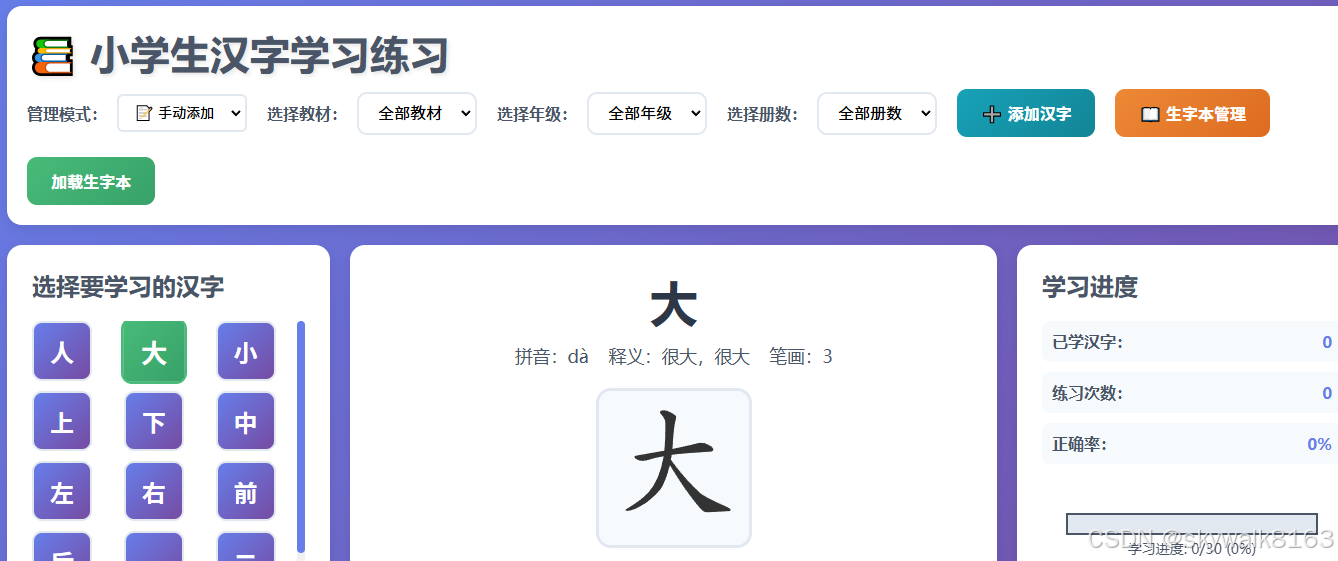 - JavaScript :实现了教材选择的事件处理和生字本加载逻辑