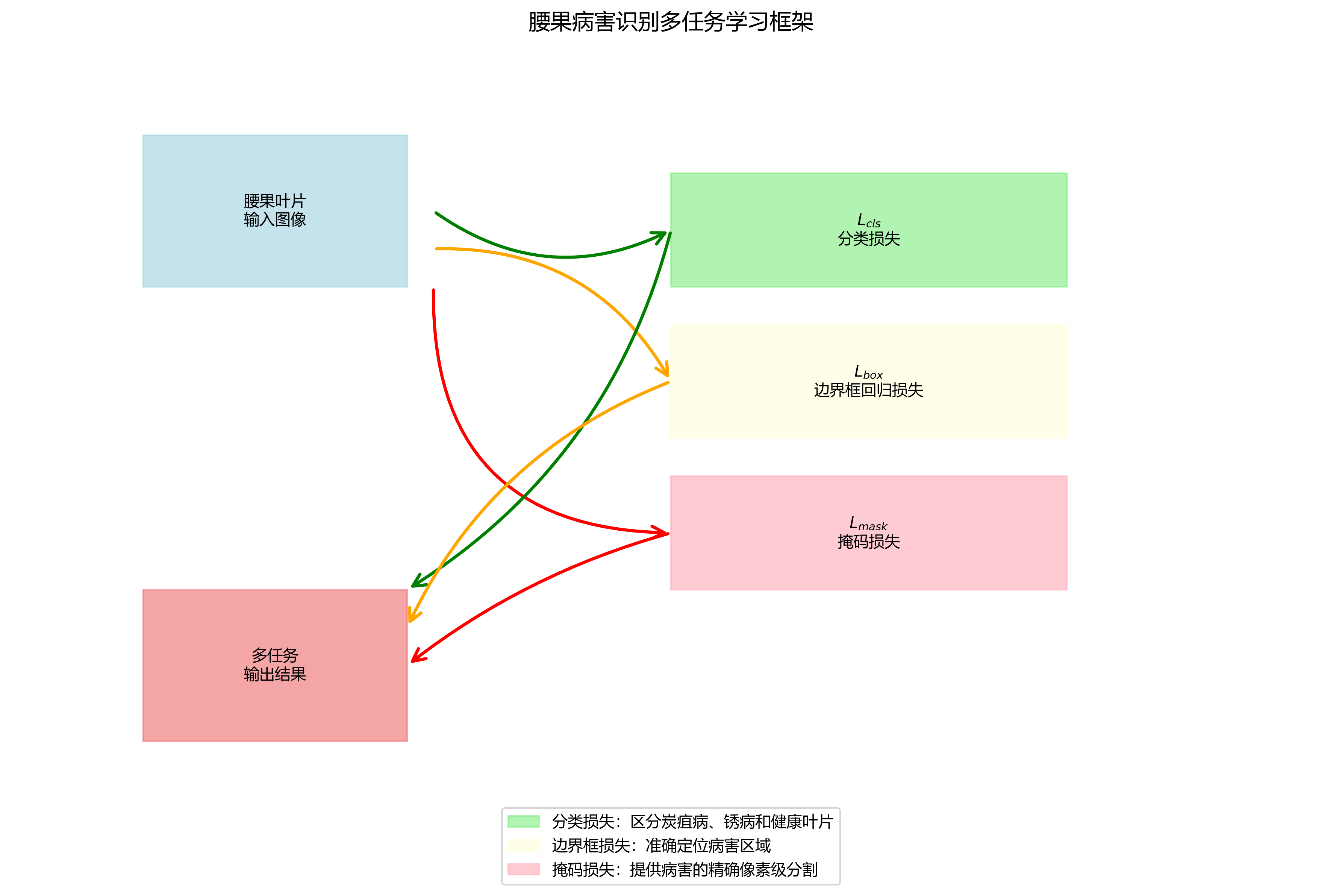 其中, L c l s L_{cls} Lcls是分类损失, L b o x L_{box} Lbox是边界框回归损失, L m a s k L_{mask} Lmask是掩码损失。在腰果病害识别中,分类损失确保模型能够正确区分炭疽病、锈病和健康叶片;边界框损失准确定位病害区域;掩码损失则提供病害的精确像素级分割。这种多任务学习方式使得模型能够同时学习病害的分类、定位和分割特征,提高整体识别性能。特别是对于腰果这种小型且形状不规则的叶片,精确的掩码分割能够提供更丰富的病害信息,有助于提高识别准确率。