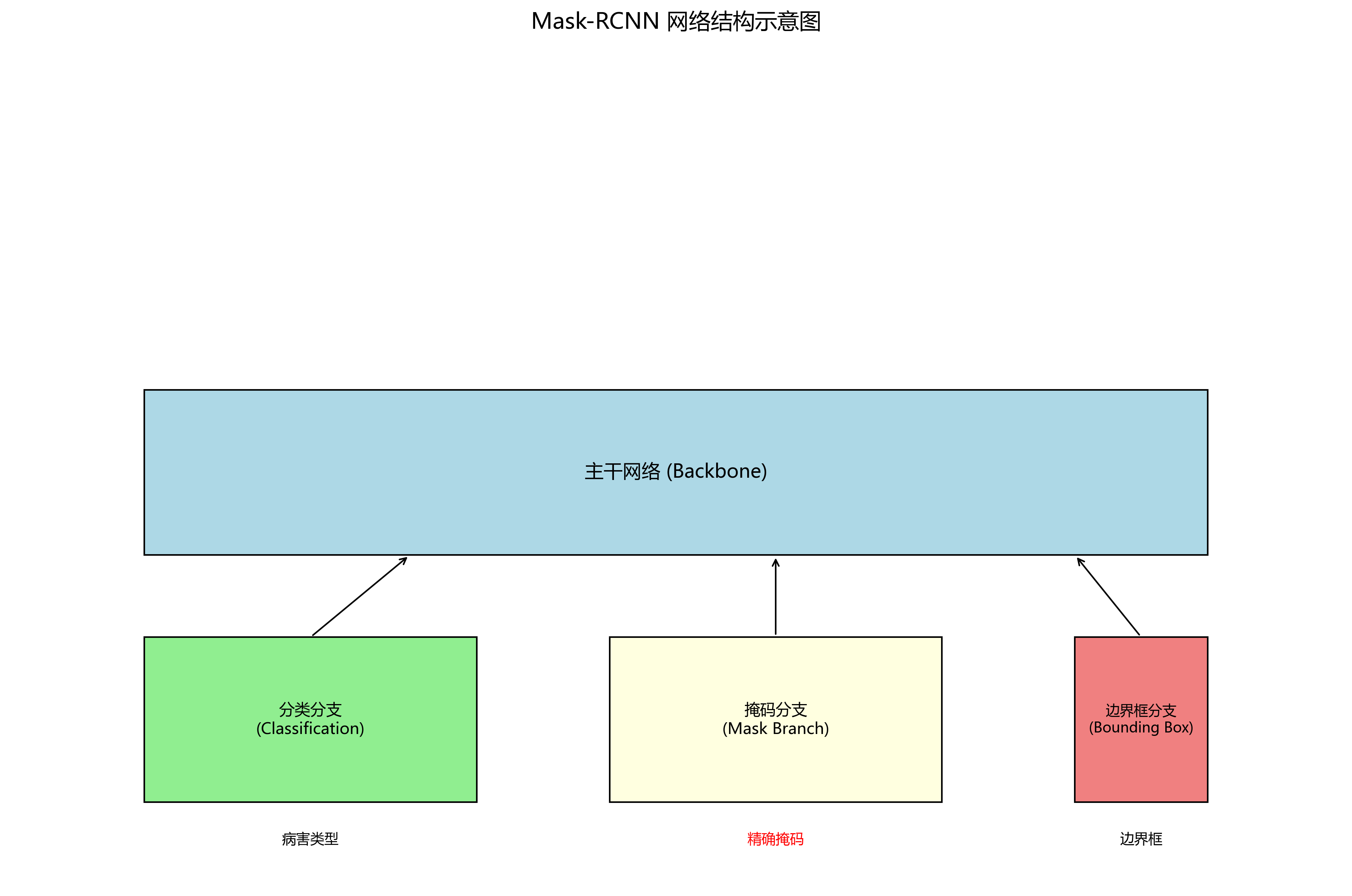 Mask-RCNN的核心创新在于引入了分支网络,用于生成每个检测目标的精确掩码。这种设计使得模型不仅能够识别病害类型,还能精确定位病害区域,为后续的病害评估提供更丰富的信息。
