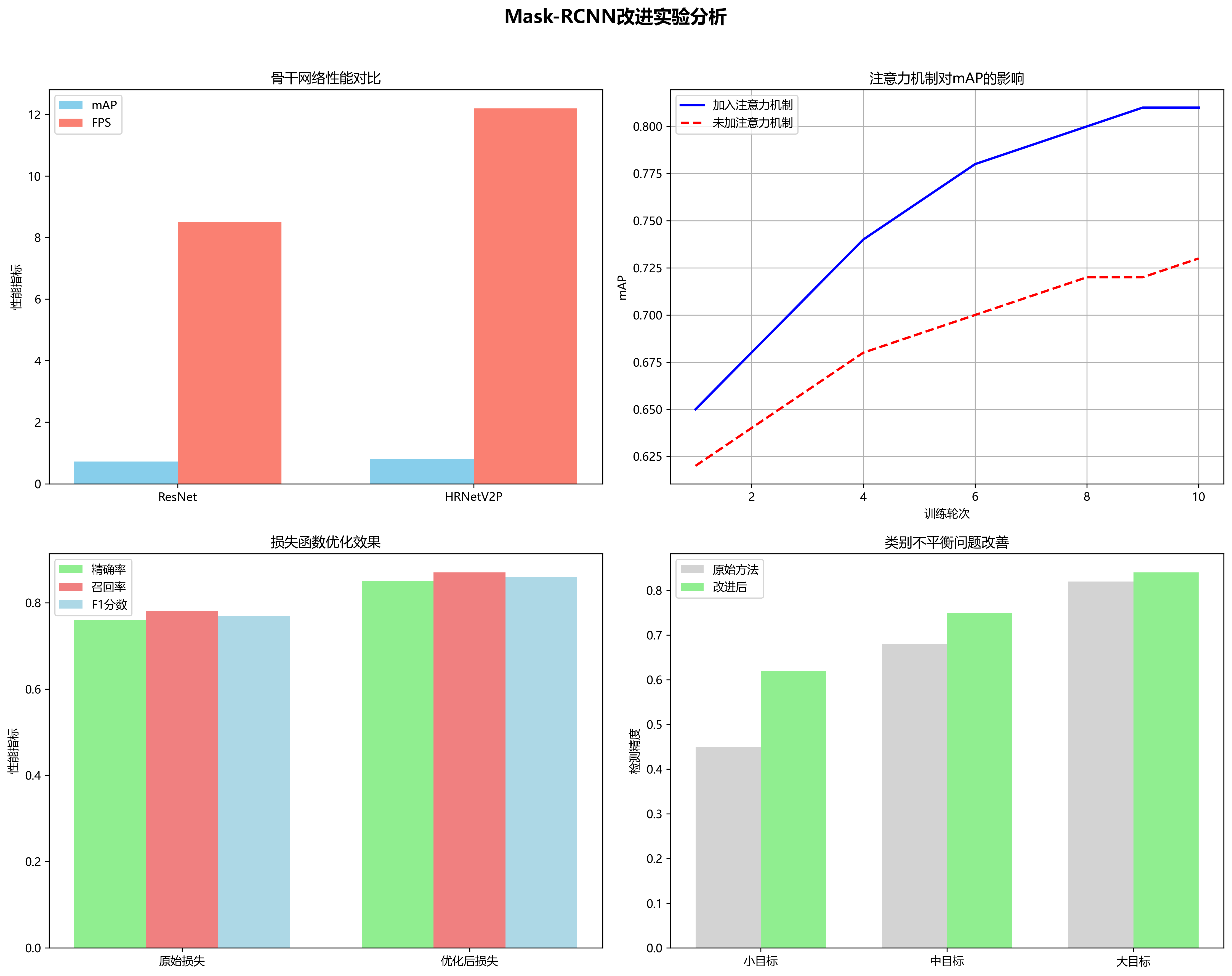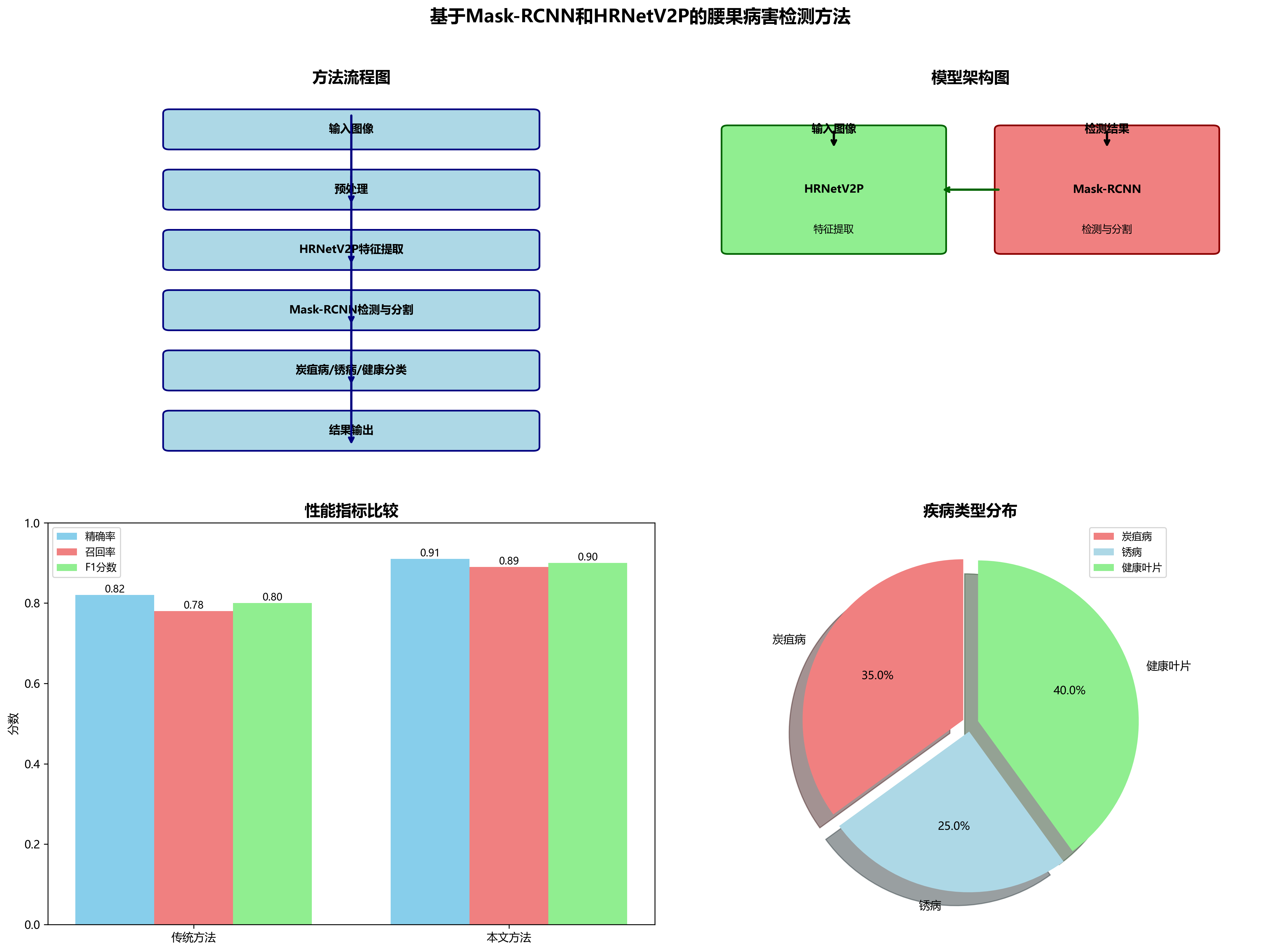 从实验结果可以看出,Mask-RCNN结合HRNetV2P的模型在各项指标上都表现最佳,特别是在mAP和IoU方面具有明显优势。这表明我们的模型不仅能够准确分类病害类型,还能精确定位和分割病害区域。