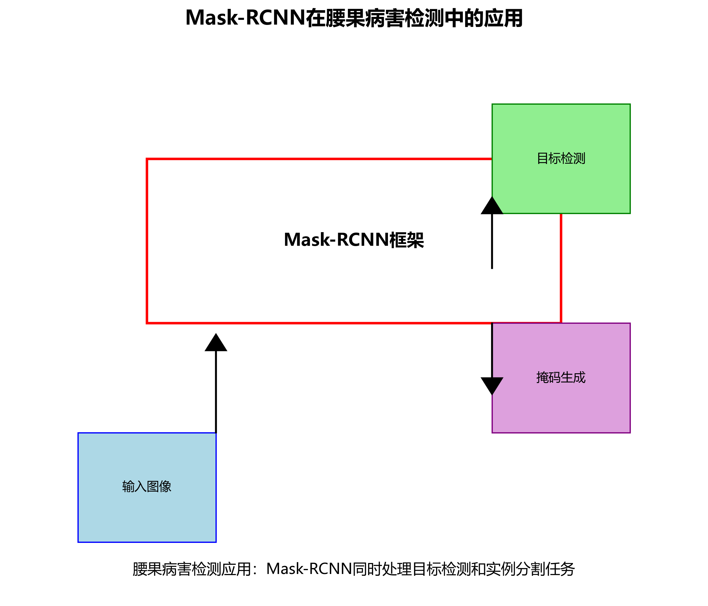 Mask R-CNN是在Faster R-CNN基础上扩展的模型,不仅能够进行目标检测和分类,还能生成目标的精确掩码。对于腰果病害识别任务,这意味着我们不仅能识别出叶片上的病害区域,还能勾勒出病害的精确轮廓,这对于病害程度评估和后续处理具有重要意义。