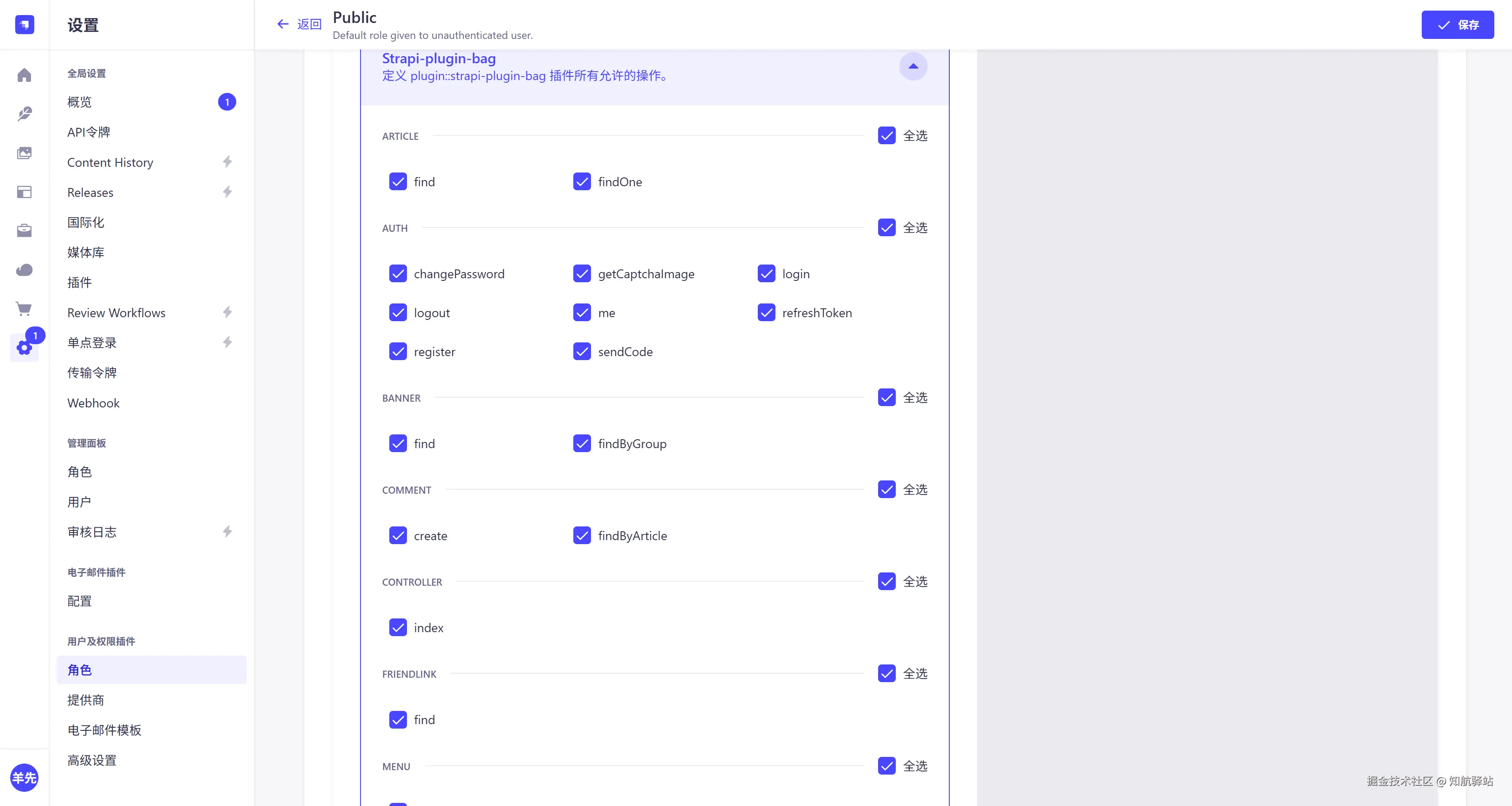 Public或Authenticated)。 - 在 Permissions (权限) 列表中找到 Strapi-plugin-bag。