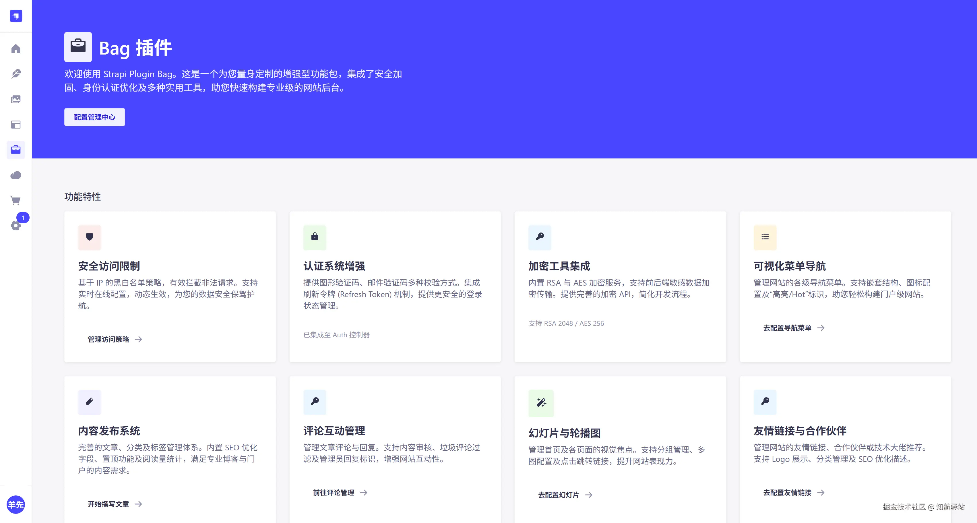 Strapi 5 是一个优秀的基石,而 strapi-plugin-bag 则是其上的"精装修"方案。我们致力于解决开发者在商业化交付过程中的那些重复劳动,让大家能把精力集中在真正的业务逻辑上。