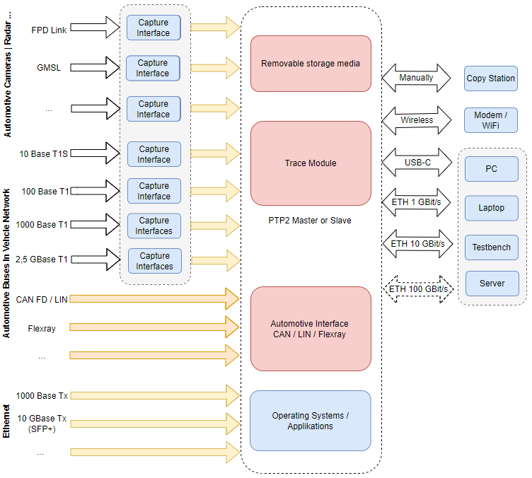 记录仪系统和接口之间采用标准化的通信协议(XCPonETH、PLP、TECMP、ASAM-CMP......),确保了时间同步的准确性,且可与常用的汽车总线信号等并行实现数据采集。记录仪系统上的标准ETH接口与这些标准化协议相结合,支持多种采集模块和接口的使用,还可直接连接装有数据采集软件(支持XCPonETH)的PC。此外,该系统支持主从级联模式,进一步扩展了数据采集能力。