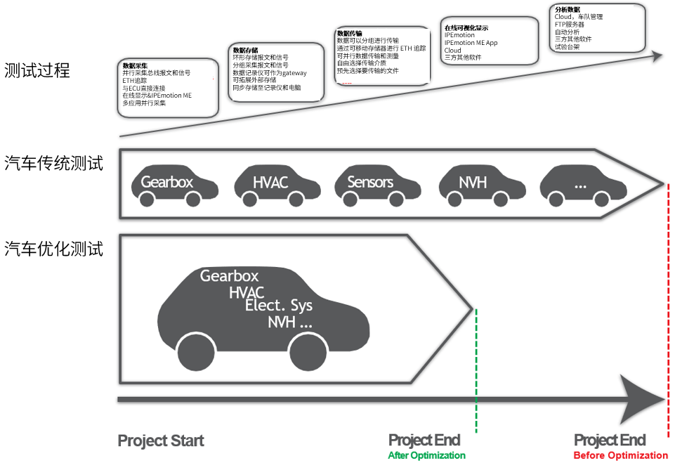 近年来,随着汽车行业的高速发展以及新技术的不断更新换代,传统的汽车测试开发周期较长,已无法满足新技术快速投放市场的需求,也无法适应市场更新换代的速度。通过优化测试方法,多个项目可同时进行,并在测试完成后将数据分组发送给不同部门进行分析。由此不仅缩短了整车测试周期,还能在确保整车充分验证的前提下加快产品推向市场的速度。