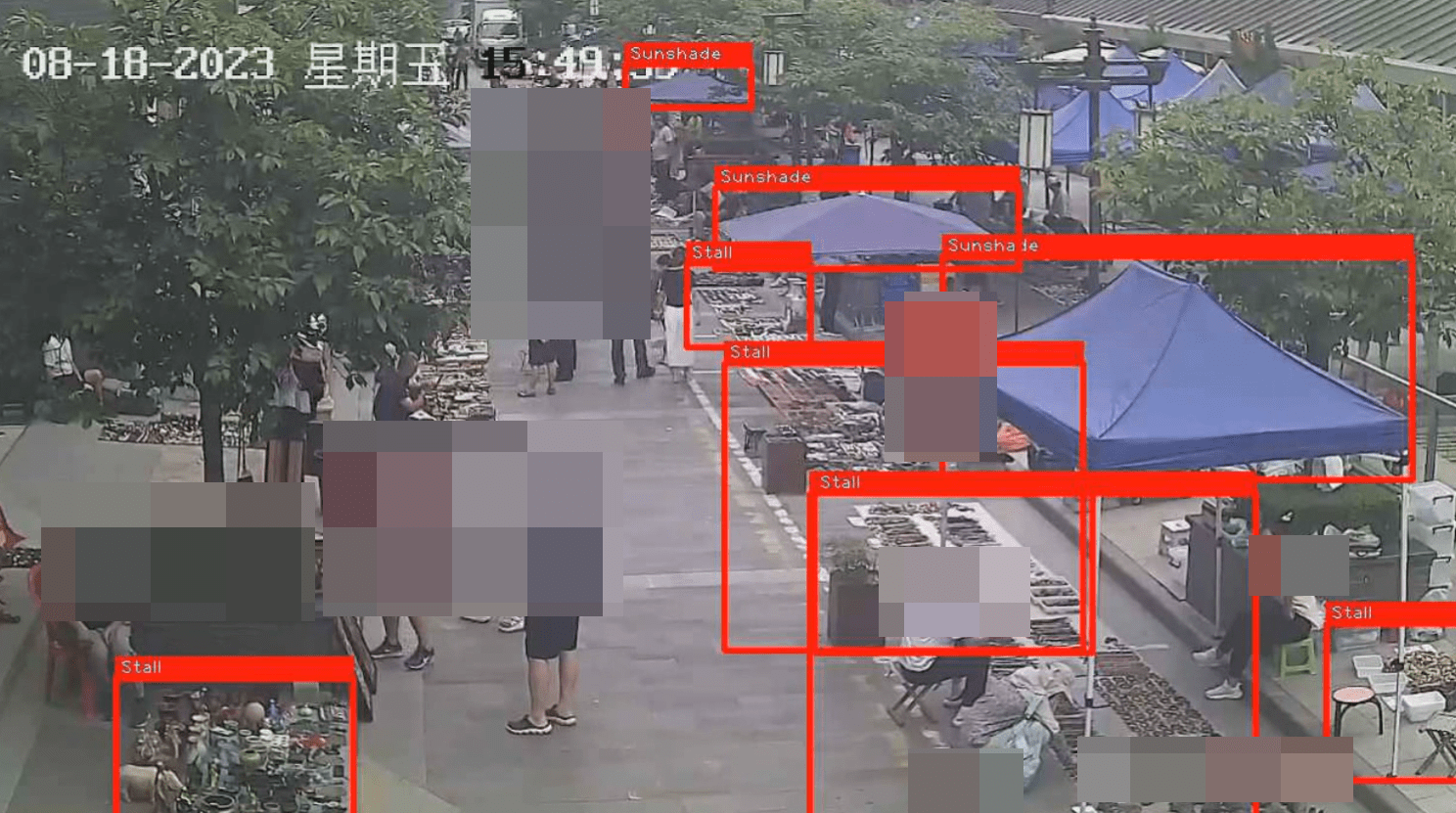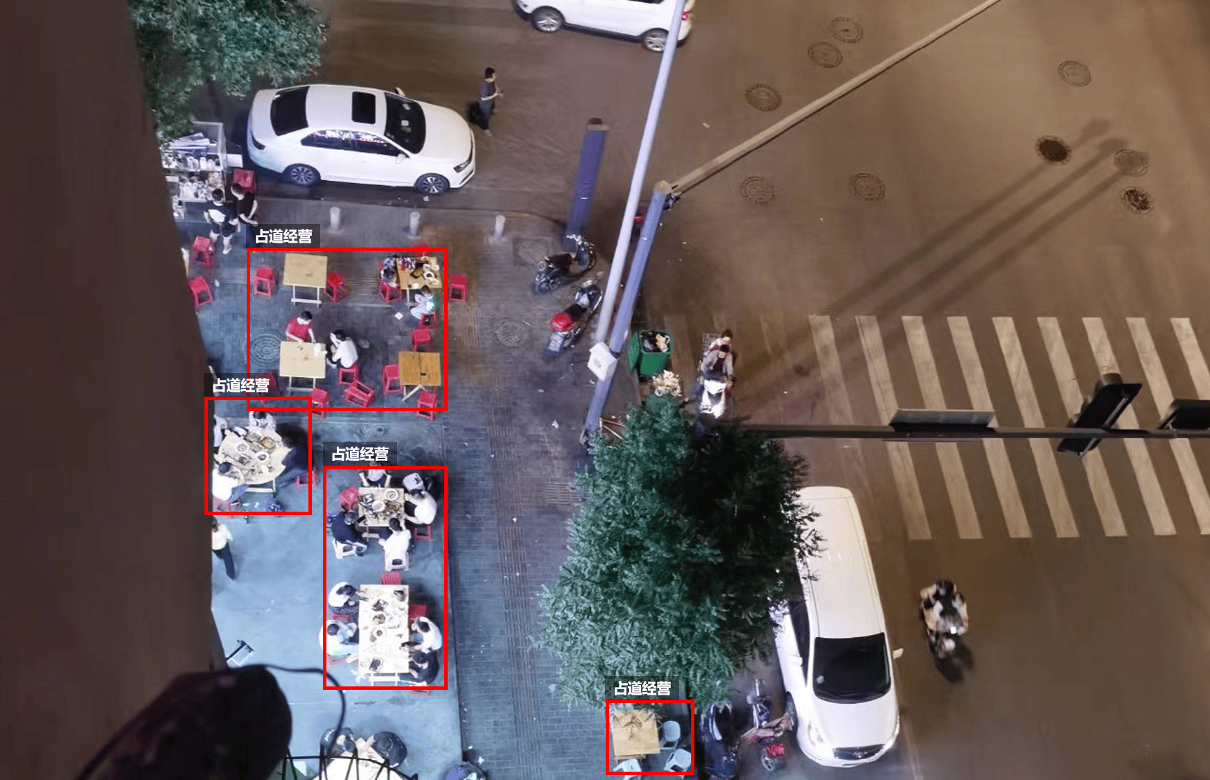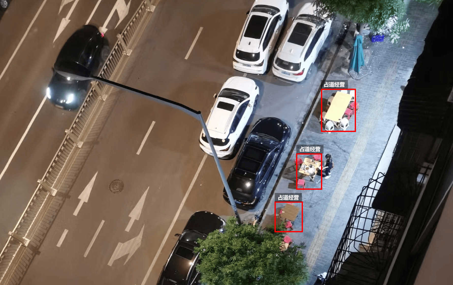 - 流动商贩占道经营:需识别具有"摊位"特征的物体(如手推车、地摊)及与之关联的人体活动(如交易手势),并判断其是否在禁止区域出现并持续。