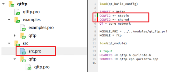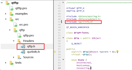 打开qt工程,修改qftp.pro文件中框选的部分,修改为下图所示。修改qftp.h文件的qurlinfo.h头文件,改为下图,该头文件路径有问题