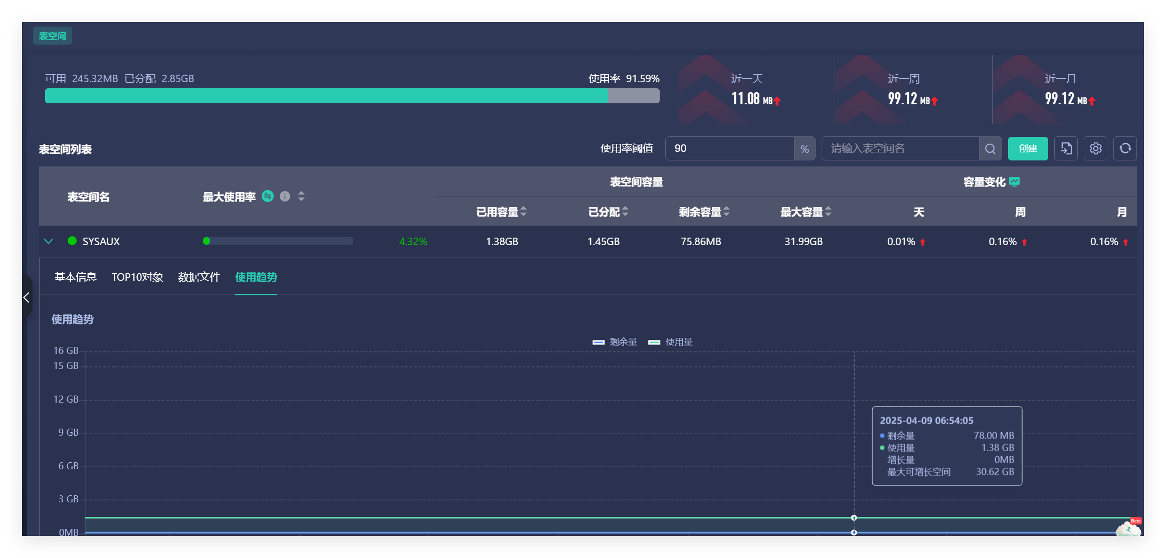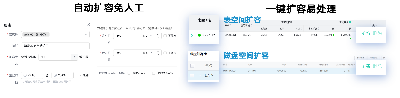 Bethune X将容量预测与自动扩容深度联动,形成完整的资源保障闭环。当系统预测到容量即将达到阈值时,自动扩容功能会启动弹性资源分配流程,无论是表空间扩容还是计算资源升级,都能在不影响业务运行的前提下自动完成,同时预留合理冗余空间,彻底解决了运维团队的"容量焦虑"。
