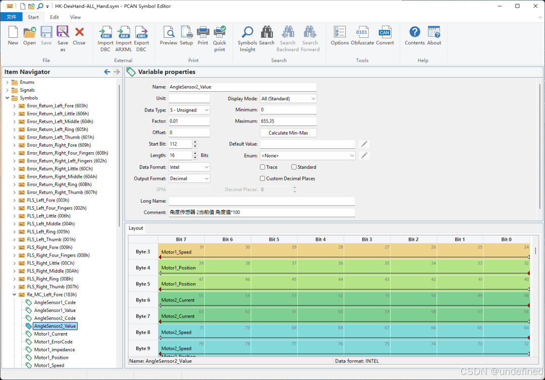 在虹科PCAN-Explorer 6软件的Symbol Editor中,可以自由建立基于CAN(FD)总线的通信数据库,包括对总线上具体报文和信号的描述、Layout,以及虚拟变量或者一些定制工程中可能用到的各种数据类型的参数。