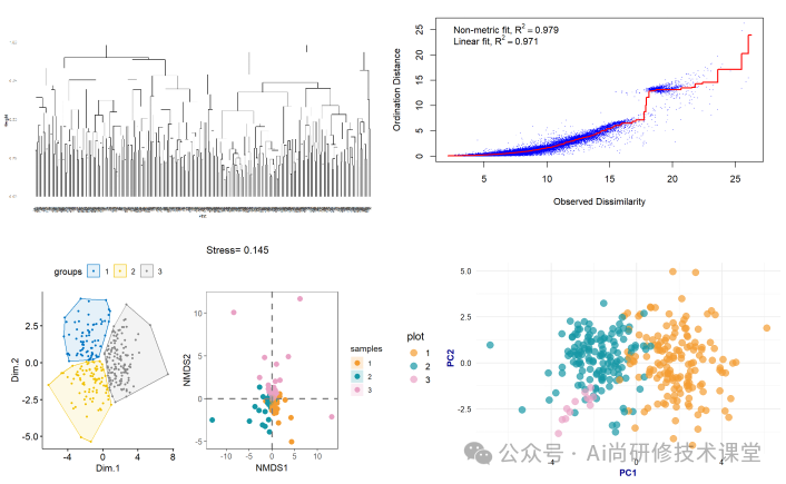 聚类分析(Cluster analysis)、 非度量多维尺度分析(NMDS)、主成分分析(PCA)、冗余分析(redundancy analysis, RDA)、典范对应分析(canonical correspondence analysis, CCA)