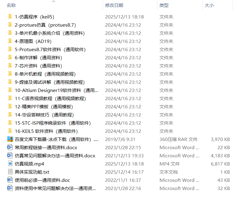全部资料包括程序(keil5)、protues仿真(protues8.7)、设计说明、答辩PPT、开发资料、资料使用介绍、仿真视频、最小系统介绍视频等。