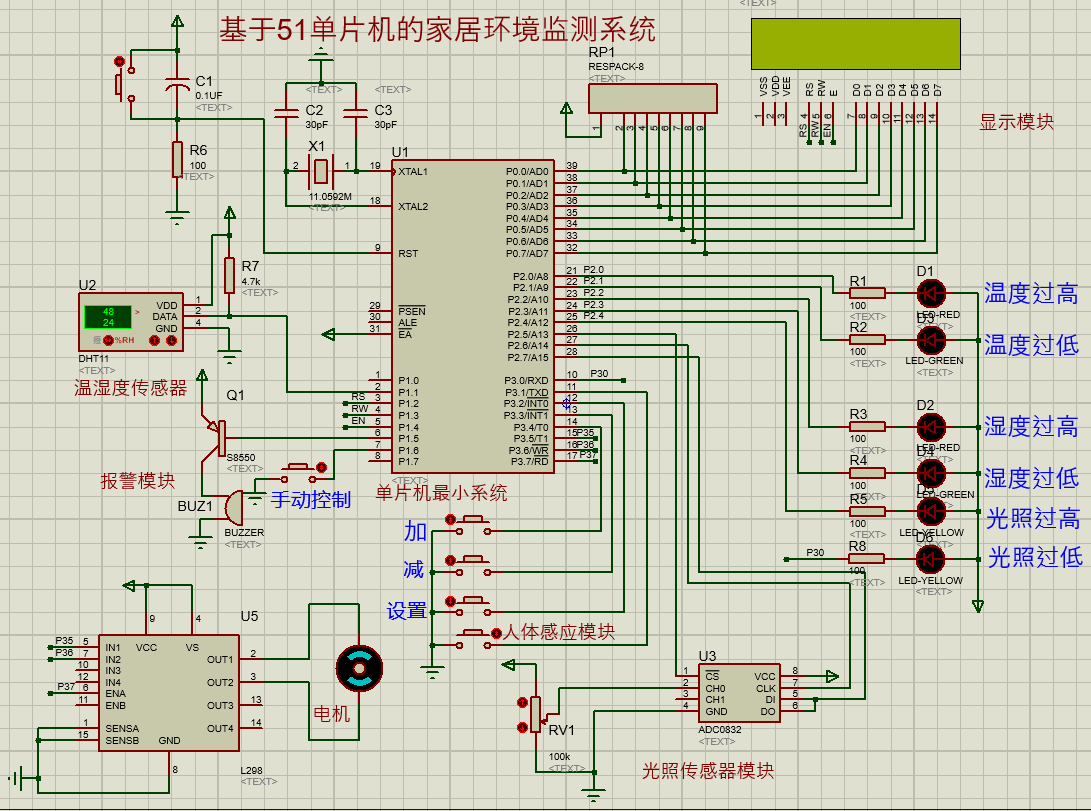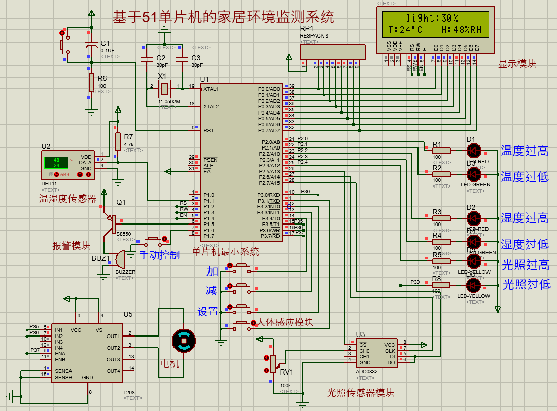 (1)实时检测温湿度和光照值并显示,超出正常范围报警。