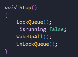 我们首先将运行状态变为假,此外还要唤醒所有在阻塞的队列。并且,我们最好让线程池先将任务队列清空再停下:
