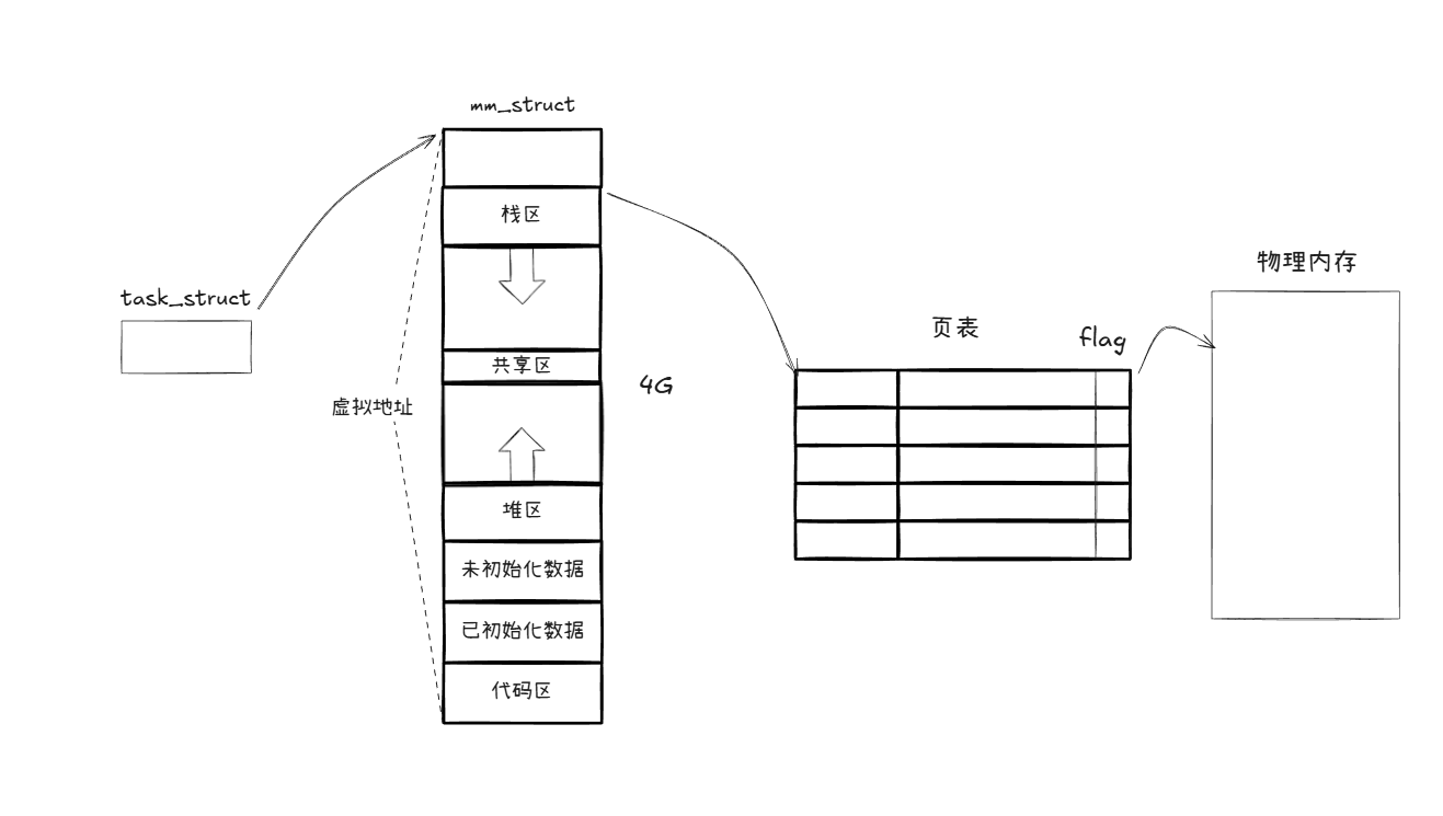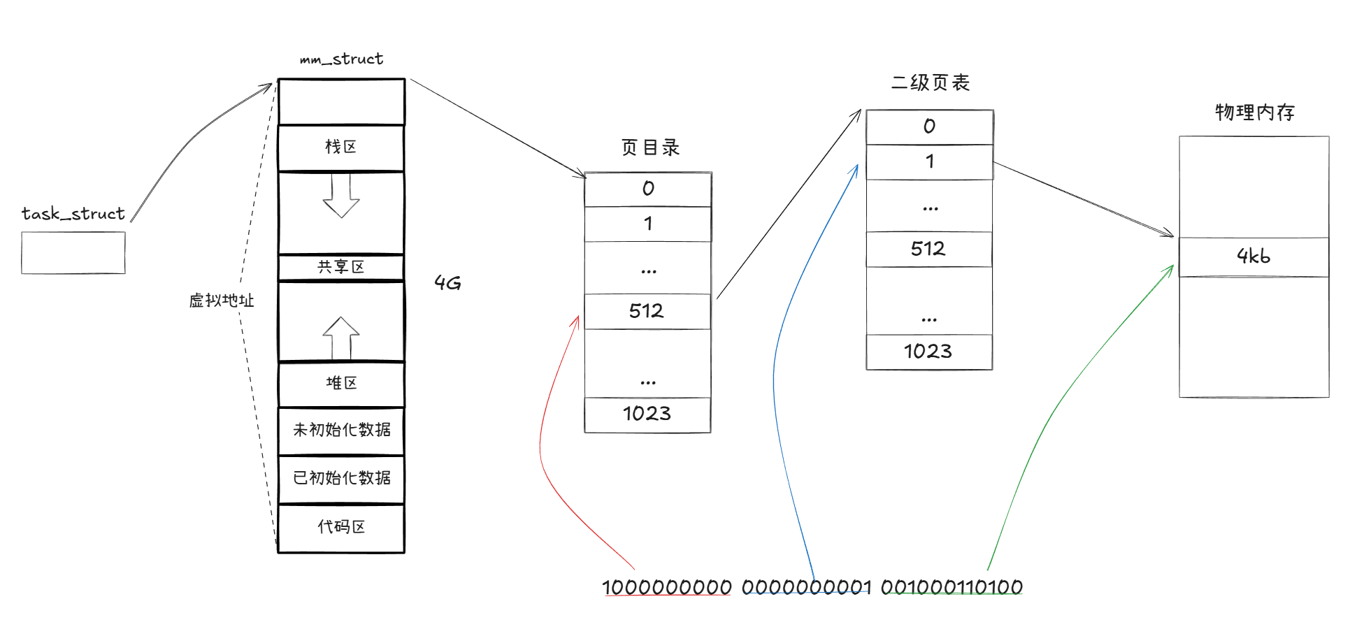 物理地址=struct page memory[ 页目录[虚拟地址>>22&0x3FF][虚拟地址>>12&0x3FF].页框起始地址 ]+虚拟地址&0xFFF