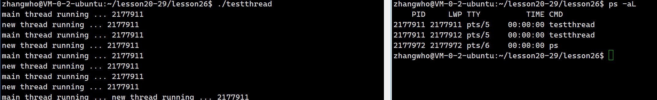 可以看到我们并发执行了两个死循环,并且这两个死循环有着一样的pid。那么OS如何区分他们呢?我们要用ps -aL来查看: